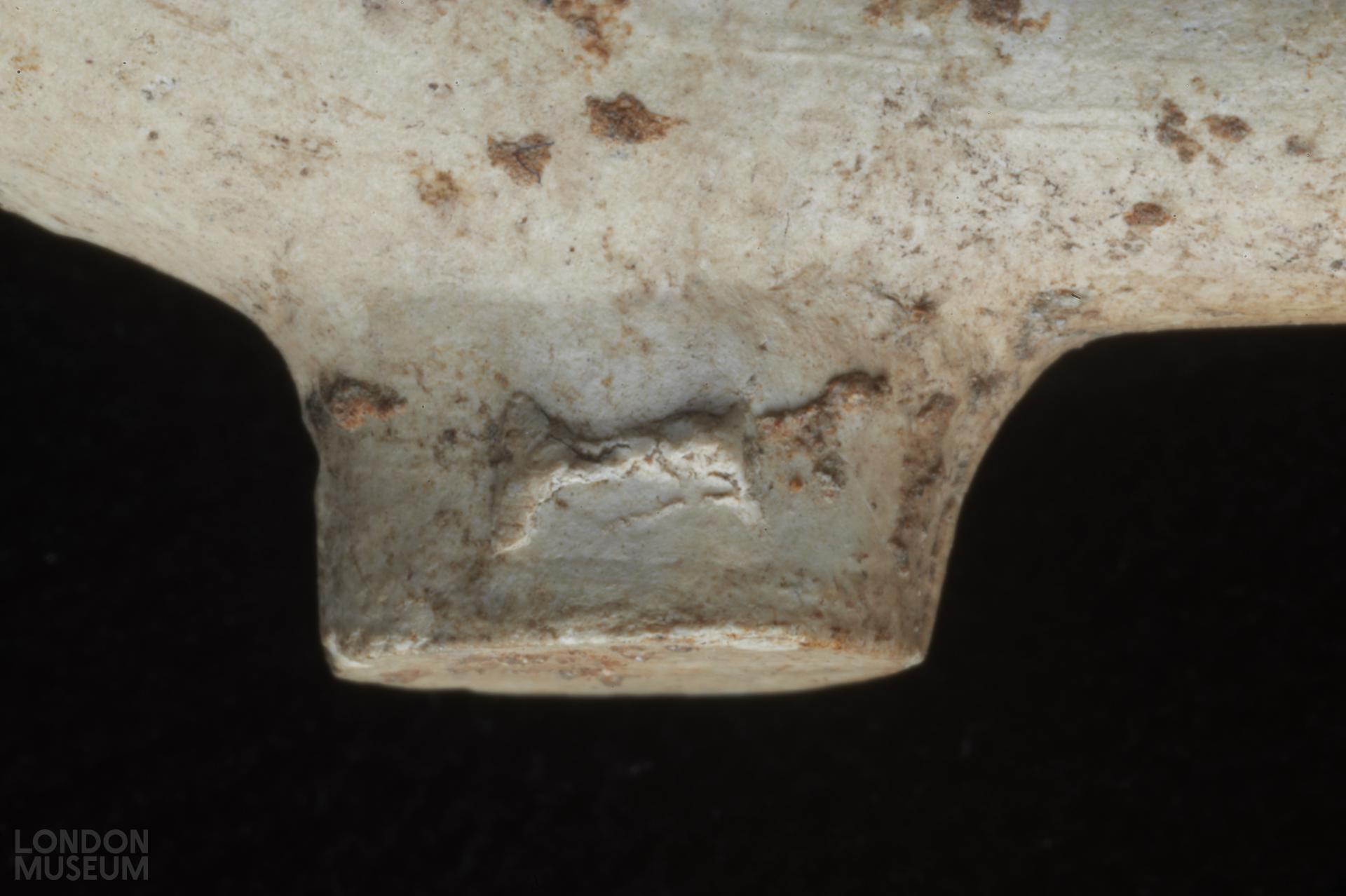 Complete bowl. Moulded marks on sides of heel, in relief: I (left side facing smoker) S (right side). Oswald (1975) type 12
