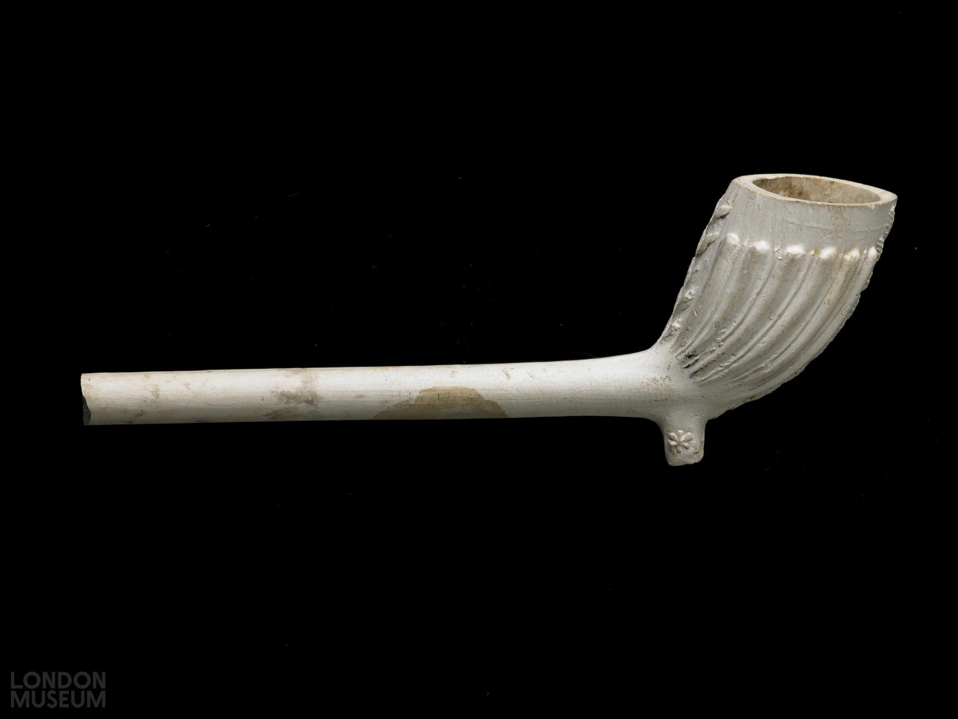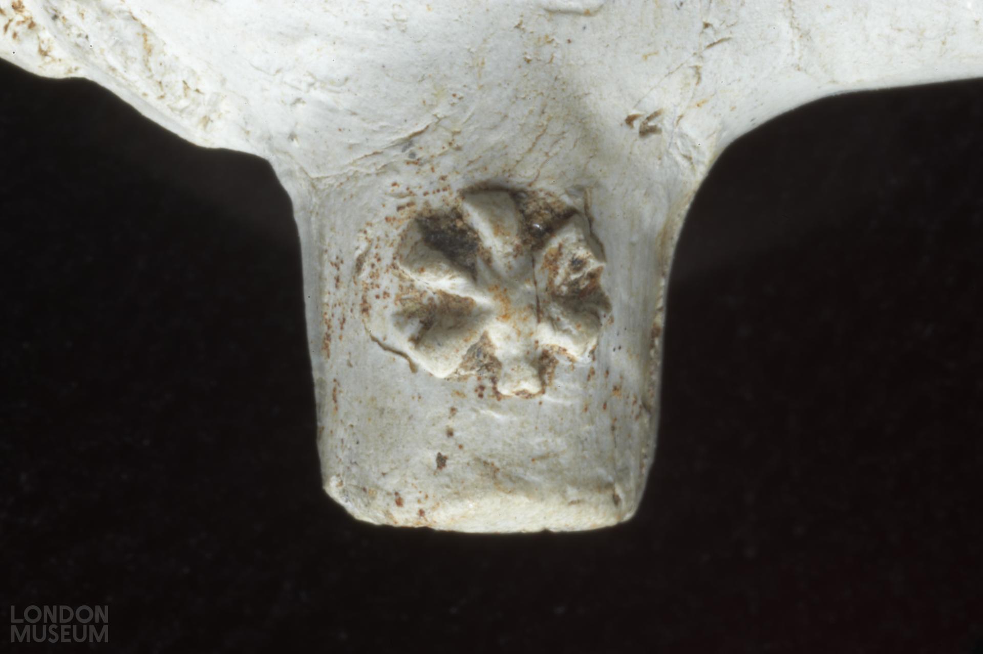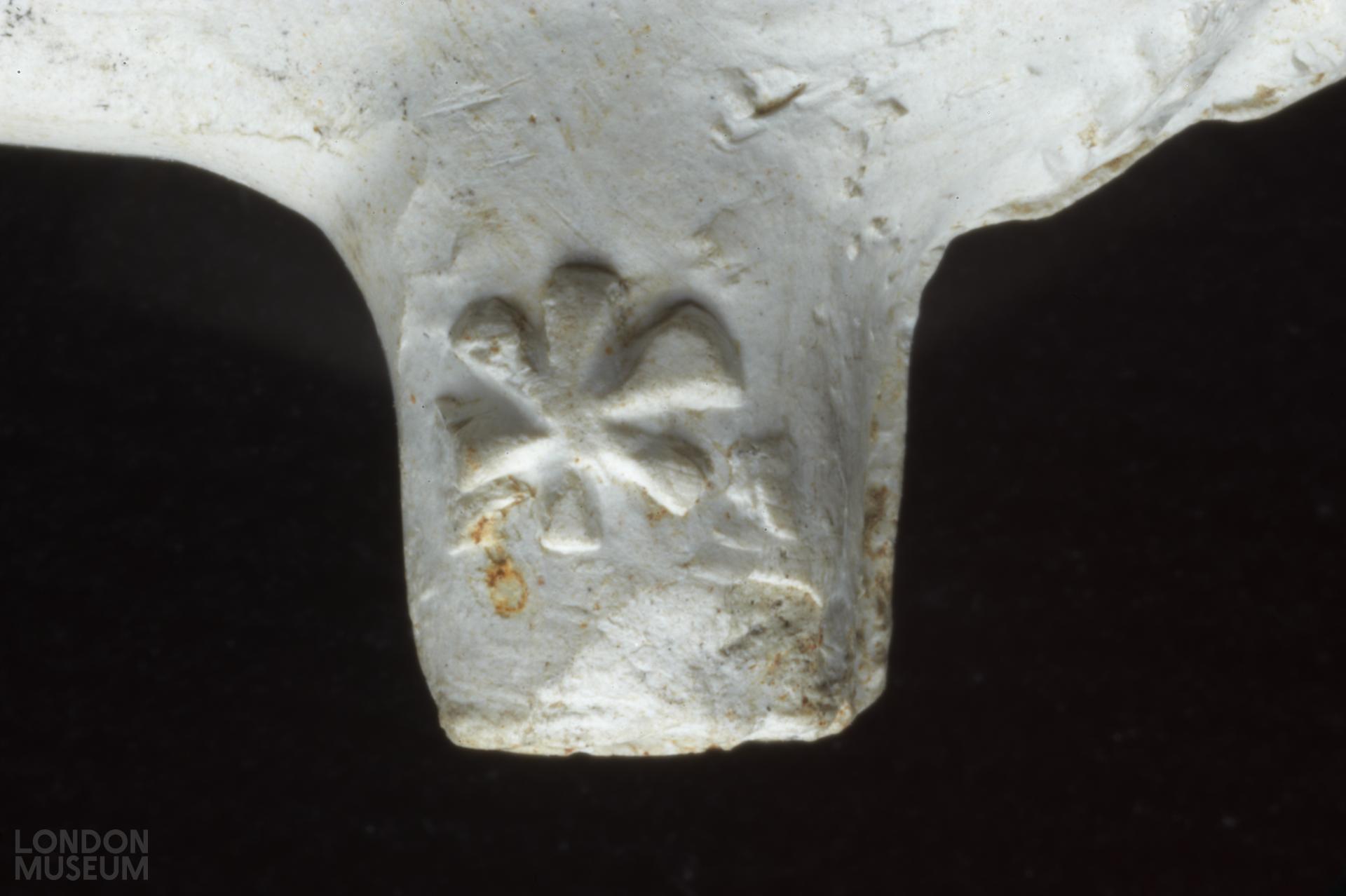 Complete bowl. Moulded decoration: an eagle, and wheat-sheaves along bowl-seams, front and back. Moulded marks on sides of heel, in relief: a star (left side facing smoker) a star (right side). Atkinson and Oswald (1969) type 27