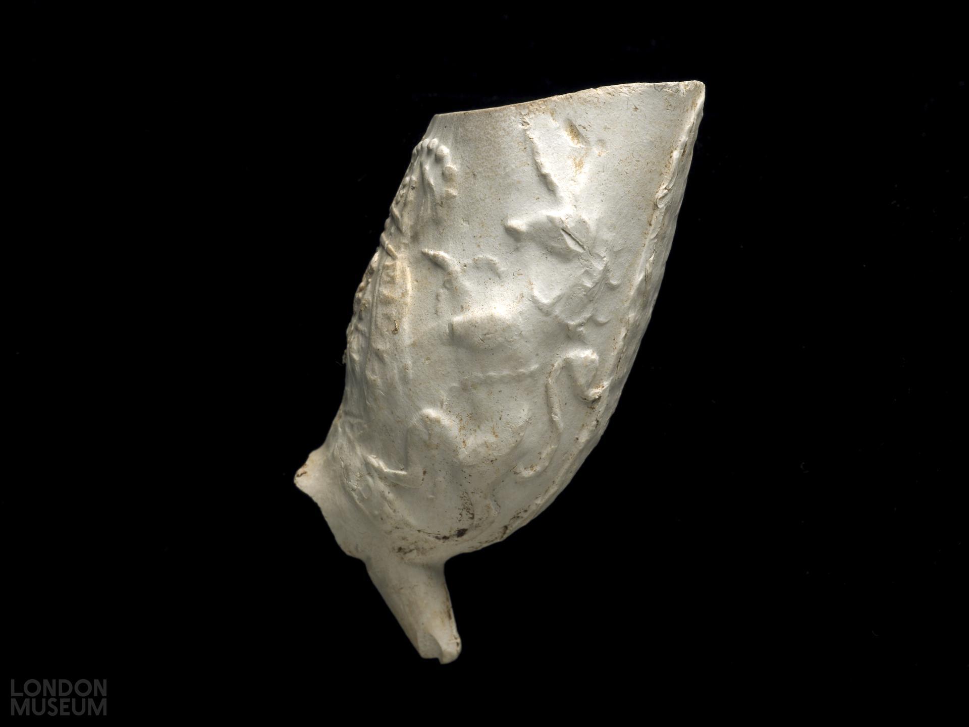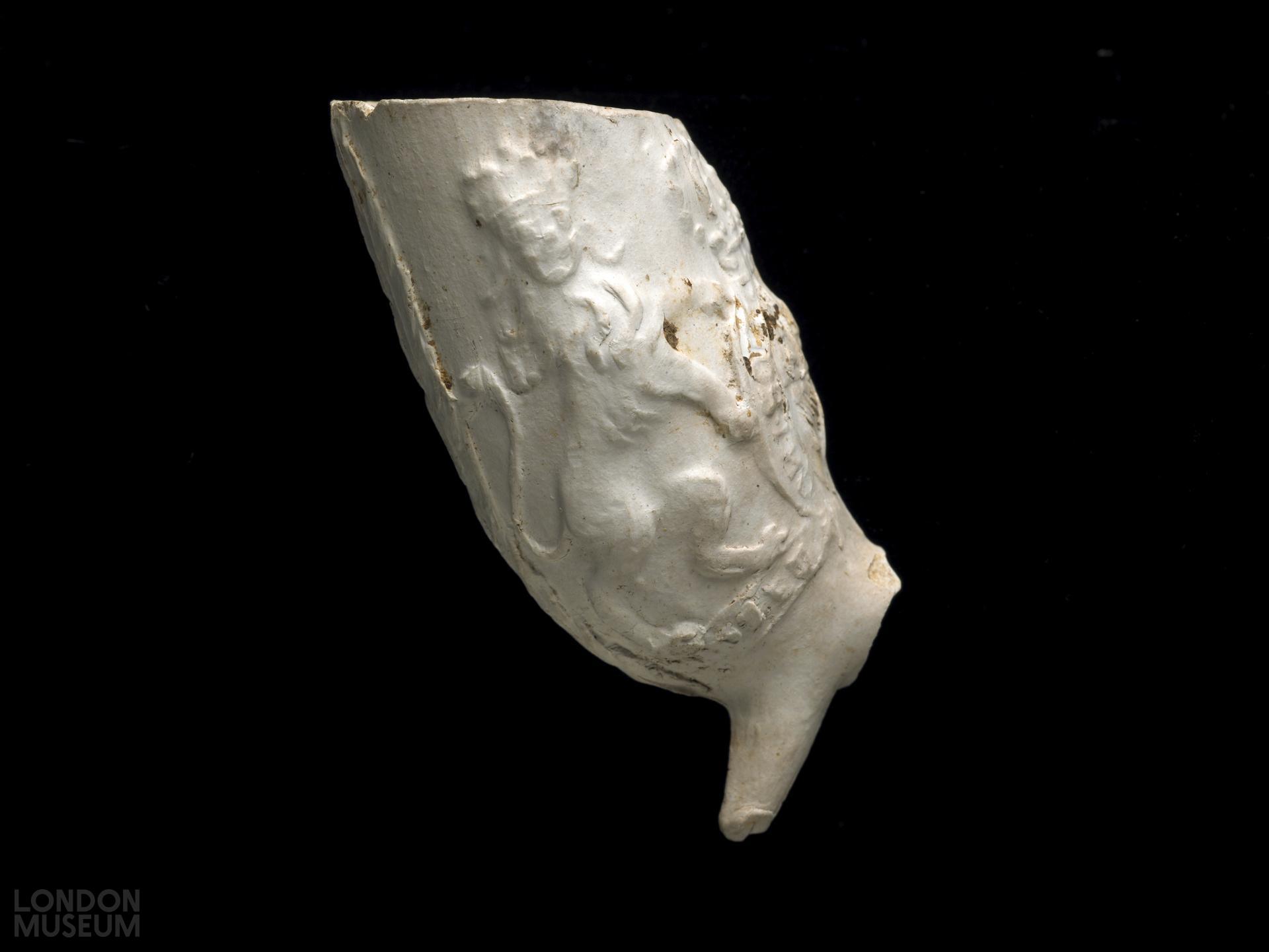 Complete bowl. Moulded decoration: thick leaves (poorly impressed) along bowl seams, on front only; on back of bowl, relatively well impressed, above a ribbon with motto DIEU [ET MON] DROIT, a Garter wreath with motto HONI SO[IT QUI] MAL Y PENSE, enclosing Hanoverian Royal arms (three fleur-de-lys and harp particularly clear in second and third quarters), with lion rampant and unicorn to either side, the whole surmounted by a crown. A large group of similar pipes was excavated at St Peter's Street, London, in 1995 (site code: SAL94). Atkinson and Oswald (1969) type 26. The heraldic device dates this pipe to before the Acts of Union (1800), when England's claim to the throne of France (represented by the fleur-de-lys) was finally abandoned.