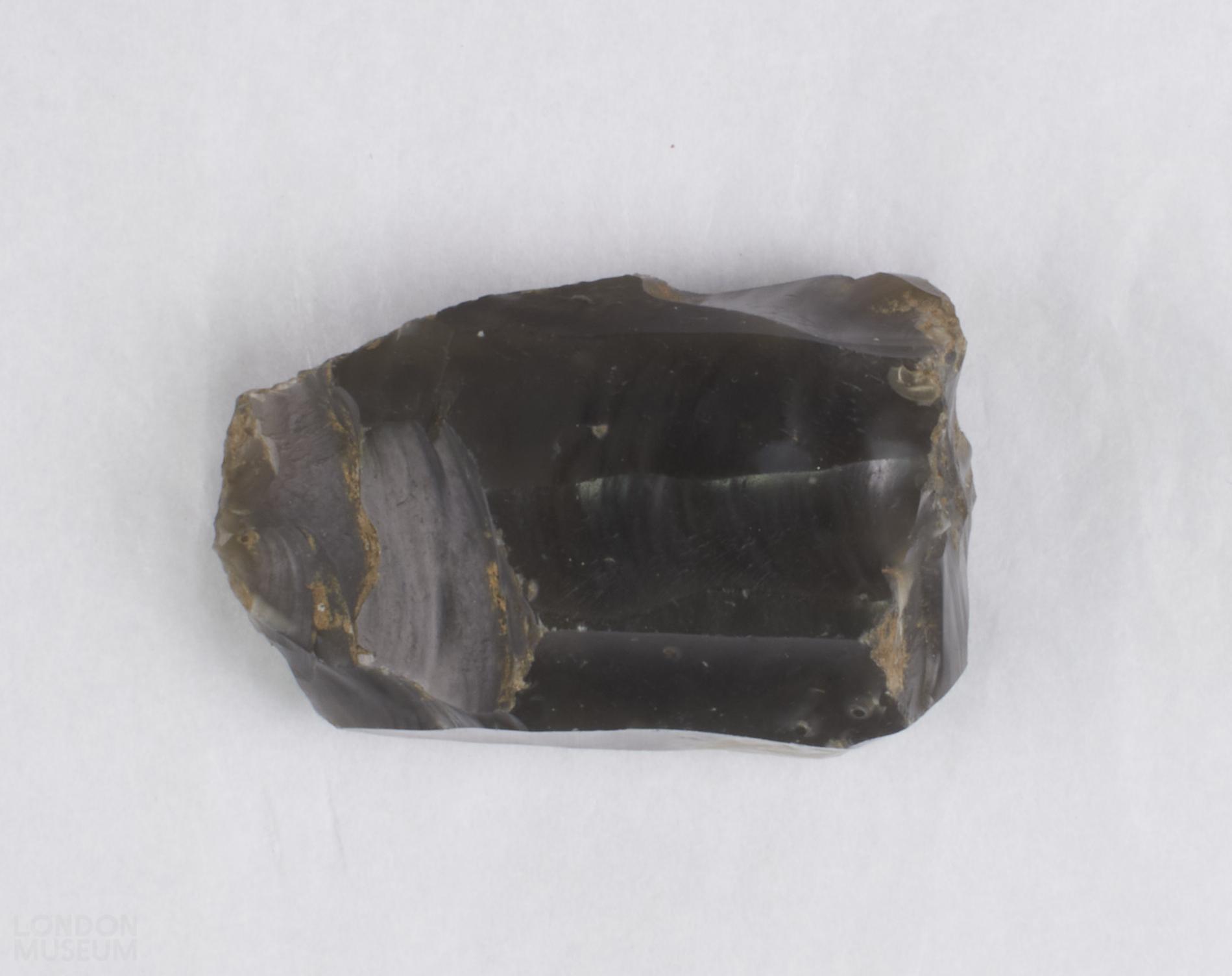 Flint core. Dark grey in colour with white sections and roughly rectangular in shape with a slanted edge on one side.
