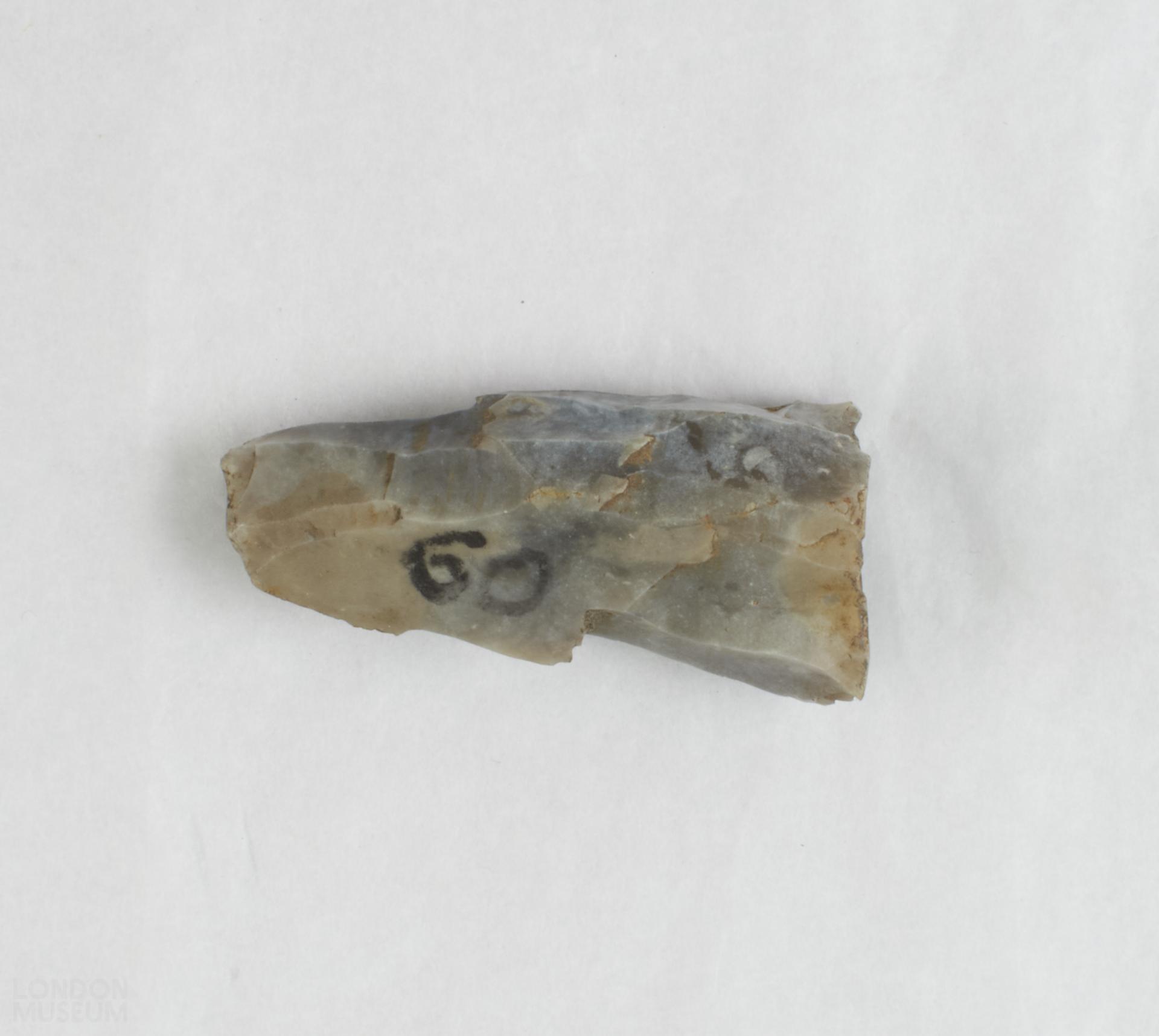 Prismatic flint core of light brown flint. Blunt pointy end with flat smooth under face covered by portion of cortex.