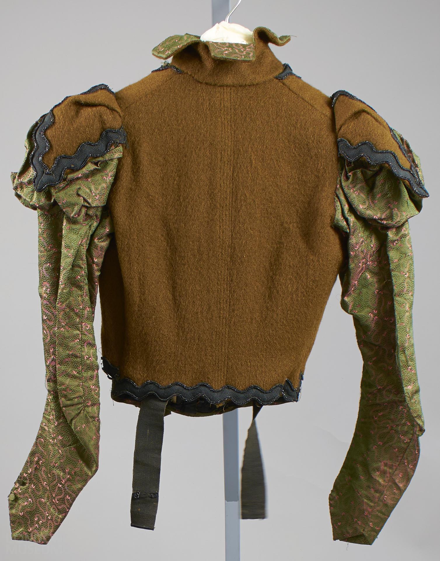 Bodice made of silk woven in green and pink, bust in brown wool with black beads trimming. Puffed sleeves. Part of brown wool dress with green silk sleeves and front and back black bead trimming.