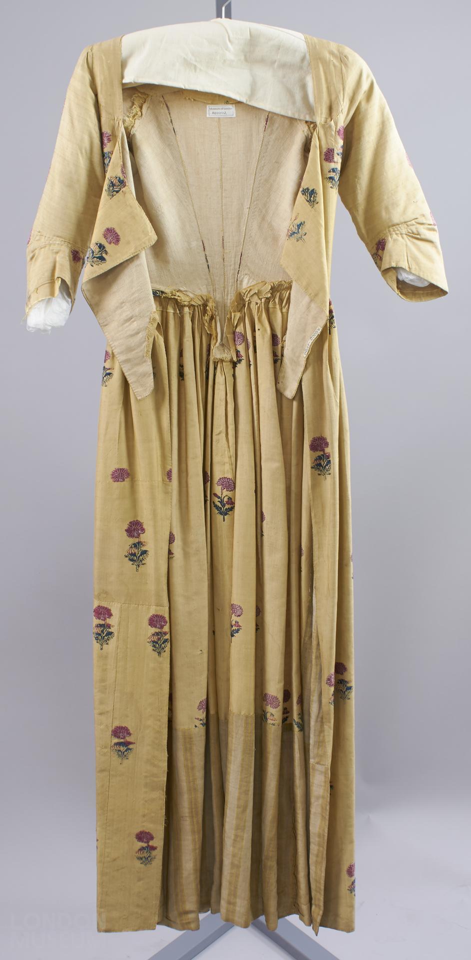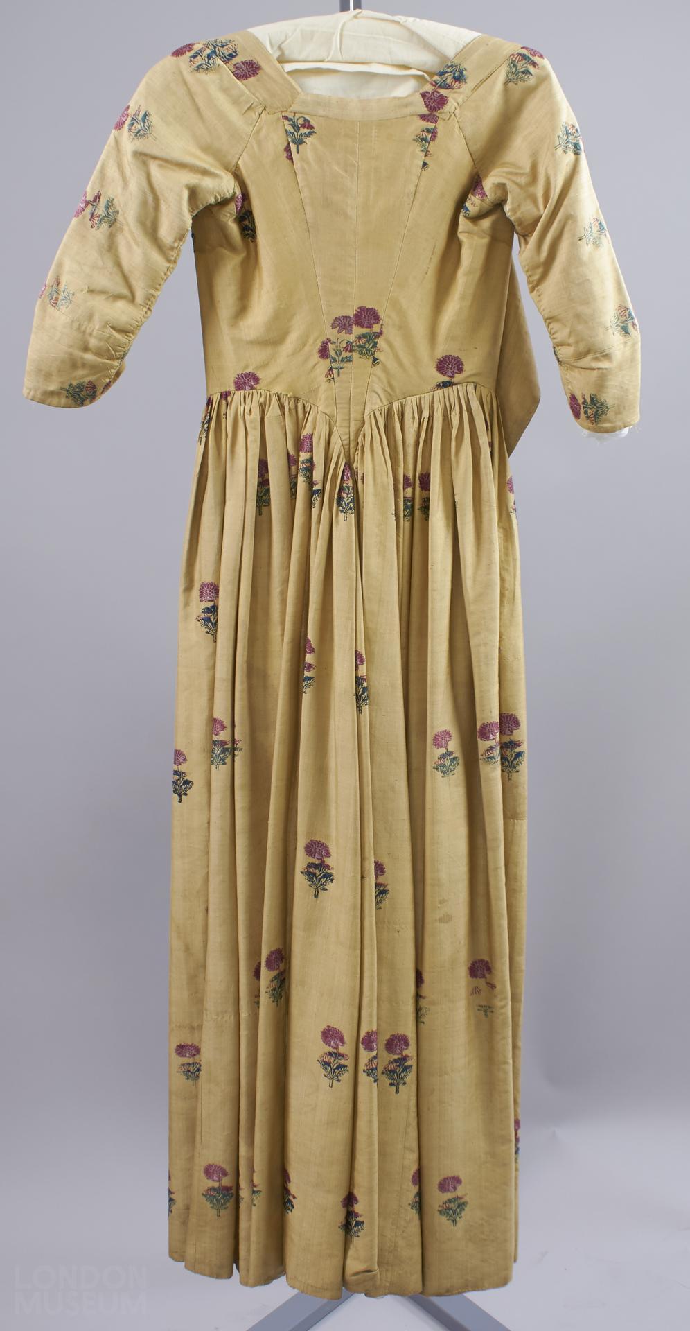 According to a descendant, this is supposed to be the wedding dress of Anne Dight, nee Symonds (see file), but the date does not really support this. The descendant sent the following information: Anne Symonds was born in 1731 at Dowlish Wake, Somerset to Edward Symonds and Honour née Hutchings. Edward was a miller and yeoman of Dowlish Wake. Anne married James Dight at Dowlish Wake on the 14th February 1750. James was born at Donyatt, Somerset in 1729, a son to Mark Dight and his wife Susannah. Anne bore James Dight eight children whose names, dates of birth, and some of their death dates were recorded in the Dight Family Bible by their mother Anne. The record of the names of these eight children also appear in a book entitled ‘A Memoir of the Family of Symonds in Somerset and Dorset’, researched and penned in the 1930s by a Symonds descendant named Henry Symonds.