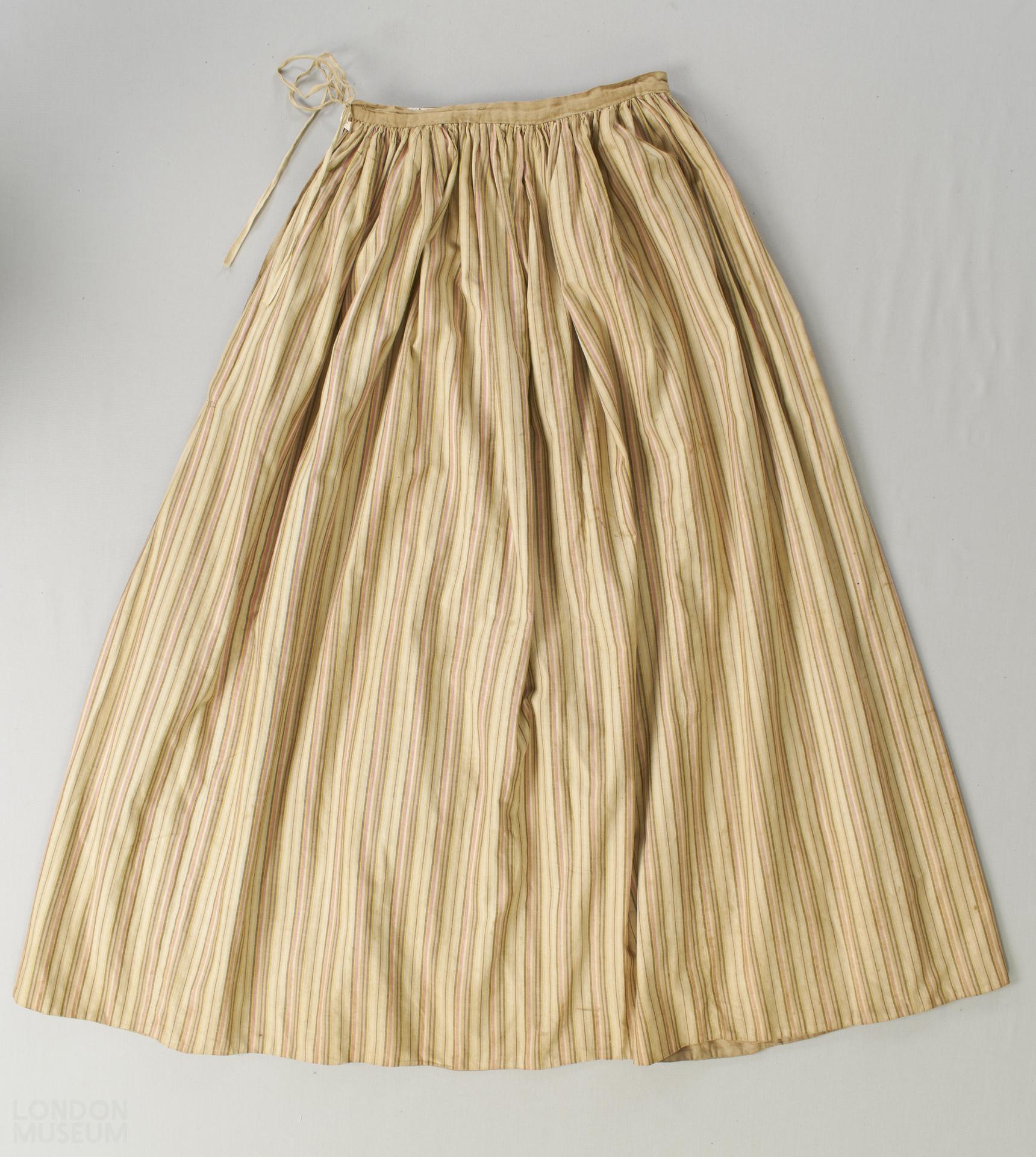 Petticoat of same material as dress A12990a with a heavy cotton lining which may be machine stitched. The petticoat has a repeating pattern of vertical stripes of various widths in the colours yellow, red, brown, black and off-white. Gathered into waistband and tied with tapes at side opening.