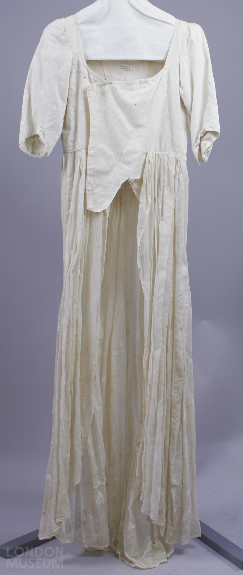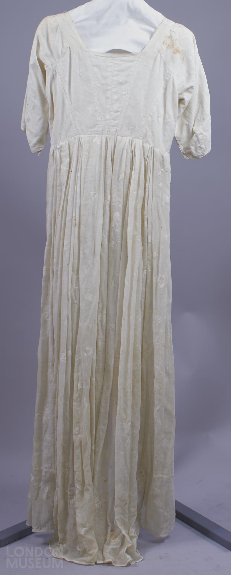 Cat no. 75 in Women's Costume 1750-1800, p. 49: Dress (robe), 1795-1800, altered from earlier dress of 1780-90; white muslin embroidered with a floral pattern in white linen, worked mainly in darning. The centre front bodice edges meet, and the skirt is open; the elbow-length sleeves are without cuffs, and the skirt has been re-sewn to the bodice to produce the higher straight waistline of the latter years of the century. Condition: good.'