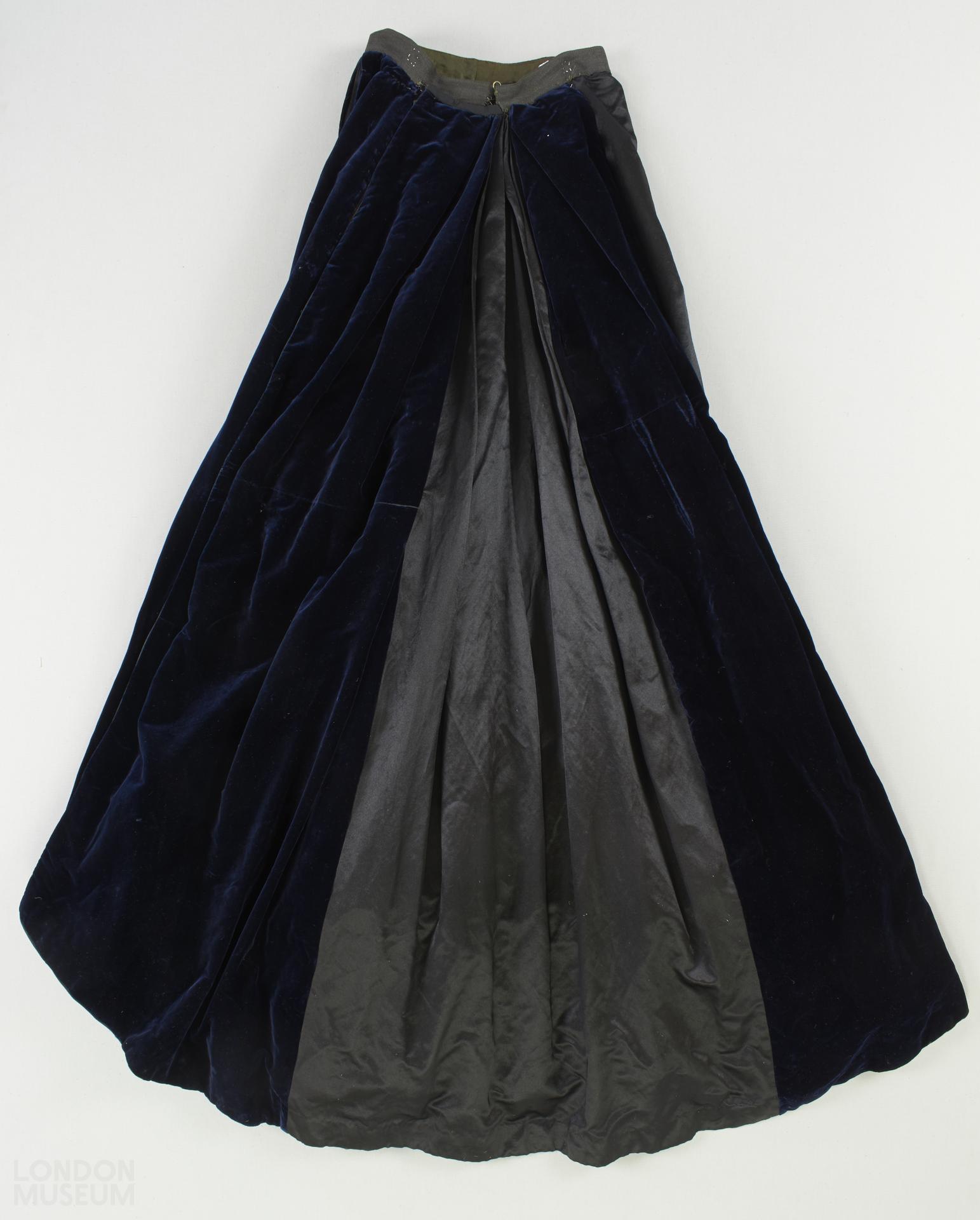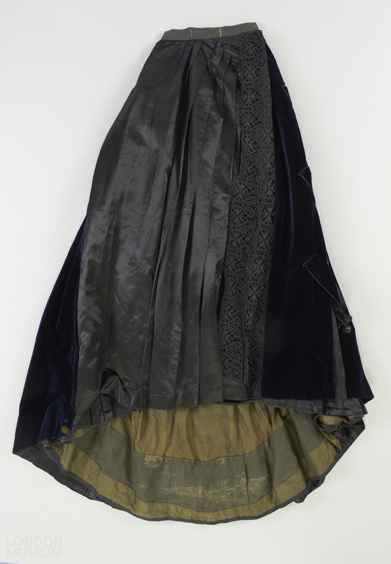 Dark navy velvet and black silk skirt with black cotton lace details down the front. Pleats over bustle in the back. Hooks and eyes for fastening at the waist. Velvet ribbon details at the back and side, with dangling beaded black balls.