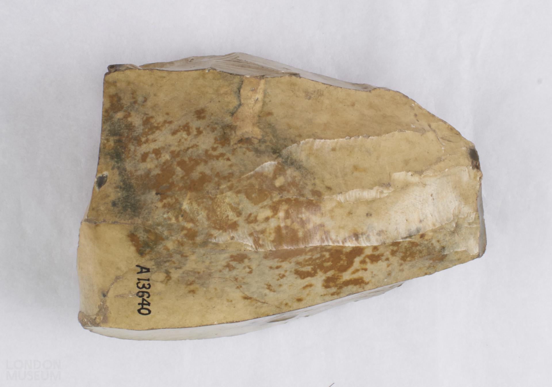 Thick core of yellow-brown flint, with heavily worked surface and blunt pointy end.