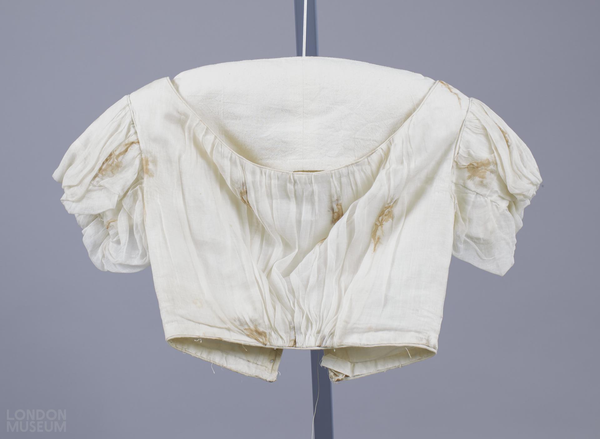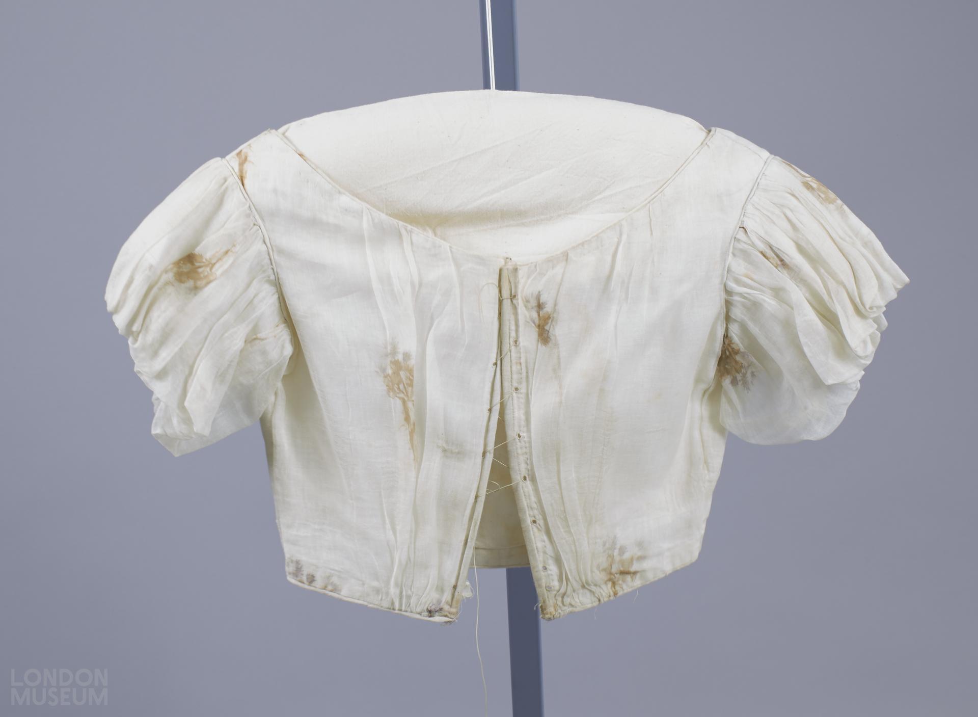 White muslin bodice printed with floral sprays in mauve and brown. Wide low neck, muslin puffed over fitting linen lining. Boned centre back fastening with eyelet holes for lacing. Short sleeves, puffed over lining. Neck and waist edges and armhole seams, piped.