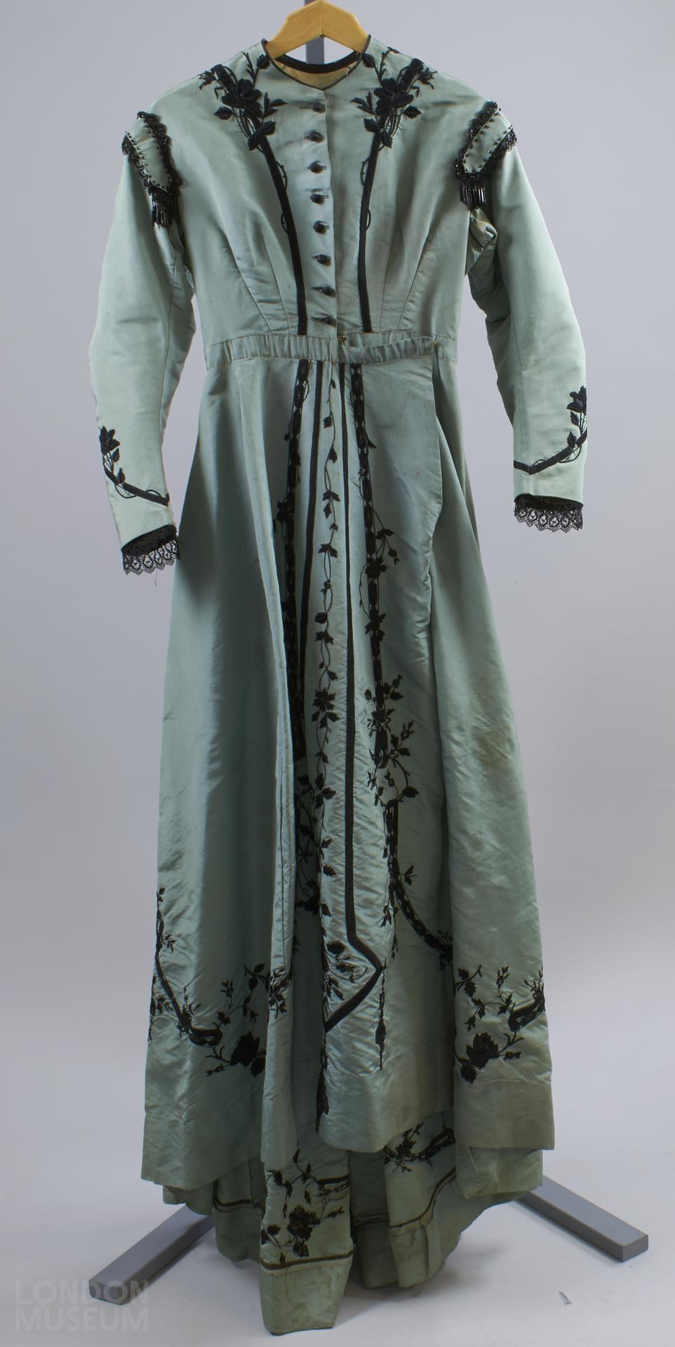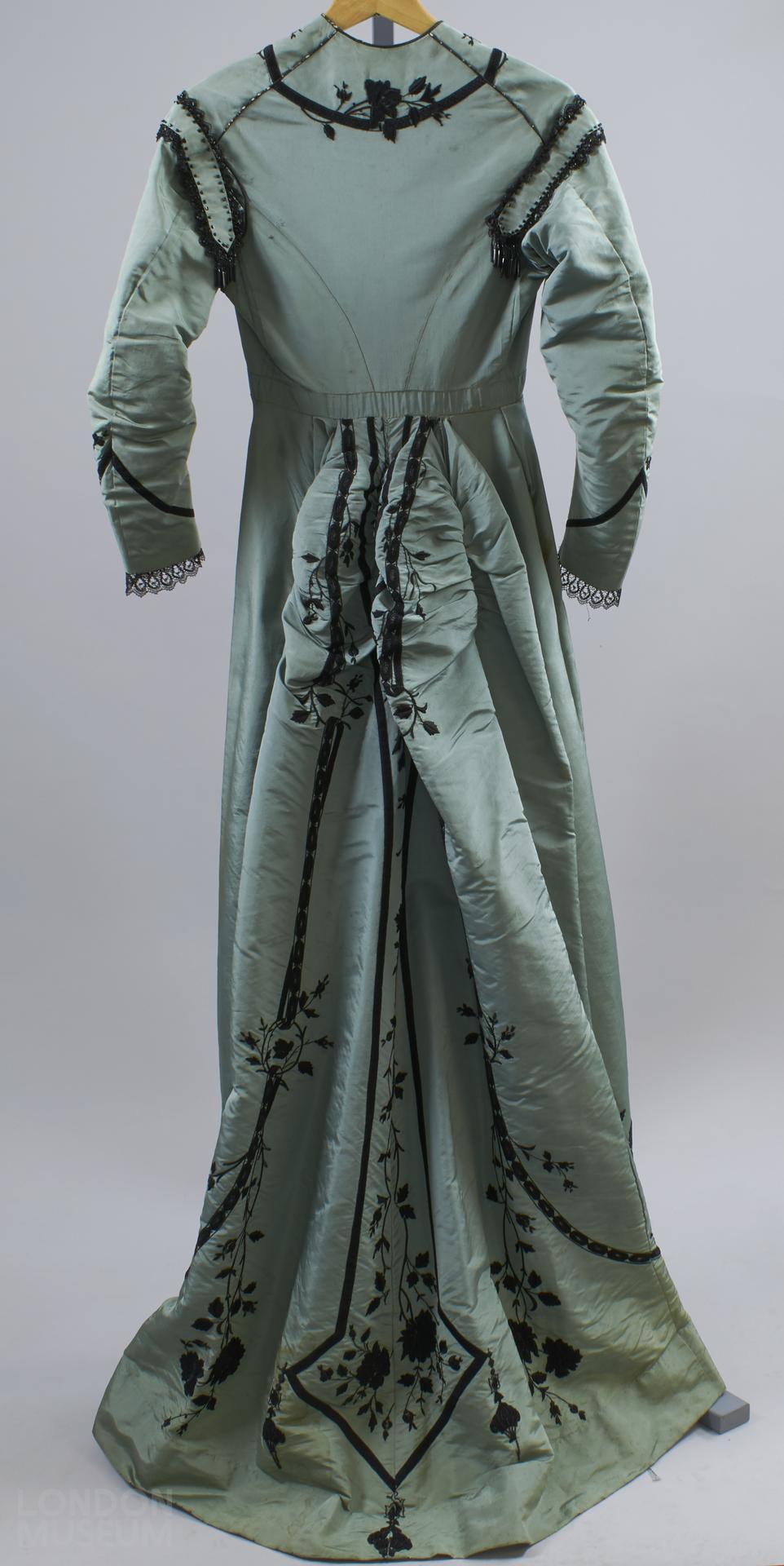 06/02/2017: A black ink stamp has been found on the cotton lining of the bodice. The stamp is on the inside and, therefore, backwards, but reads 'Marshall & Snelgrove / London' These words are in a circle and sit below a crown. Also found on this date, and in the pocket on the right side of the skirt, is a paper label with 'Polaroid 3000' printed on it. Polaroid 3000 was a camera that debuted in 1977, the year this dress was donated. It remains uncertain why this piece of paper is in the pocket.