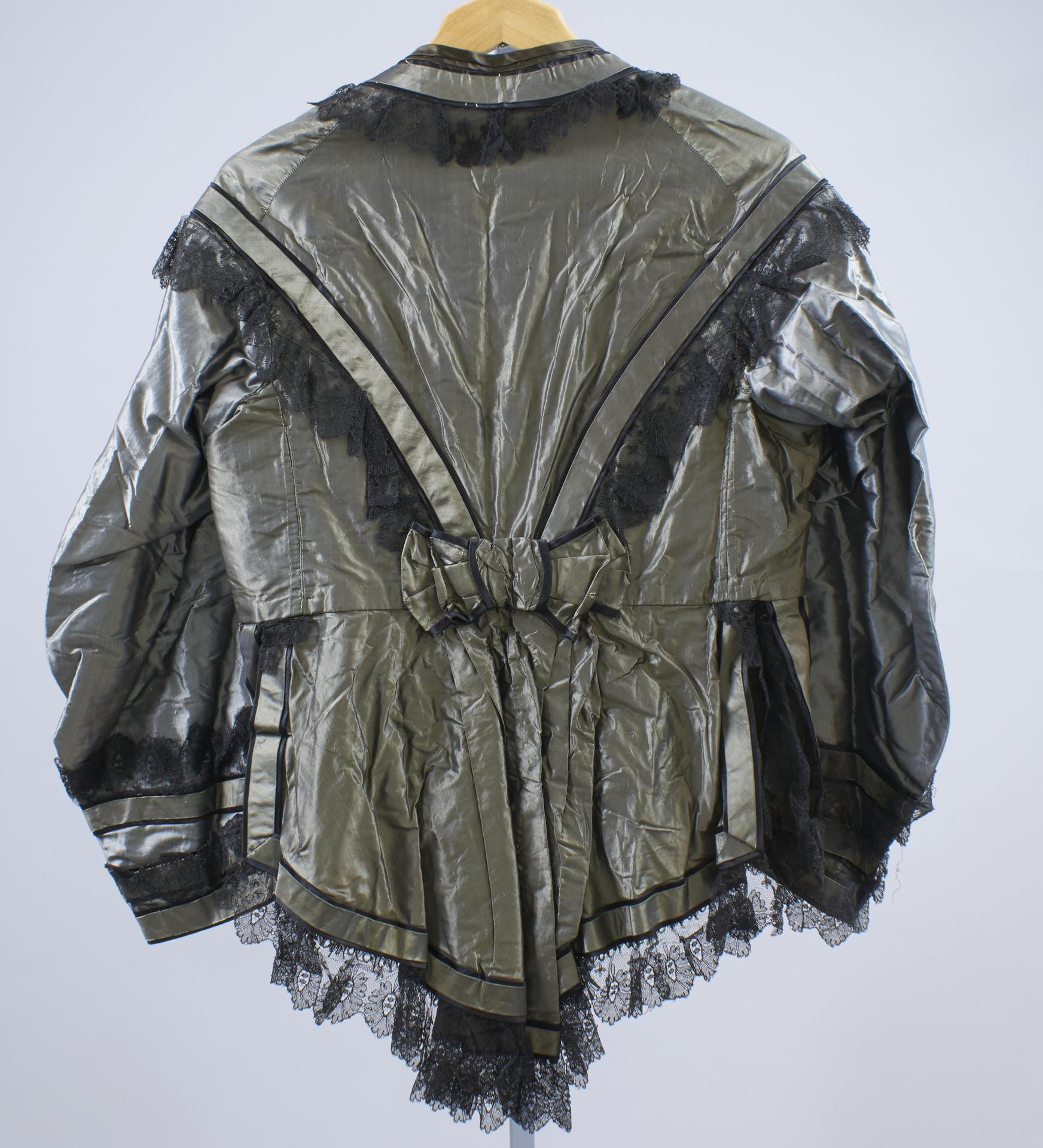 Bodice of grey/green shot silk taffeta with black satin and cotton net trimming. High neck and button down detail at the front. Bow detail at the back, with a pleated tail. Metal hooks at the collar and waist for fastening.
