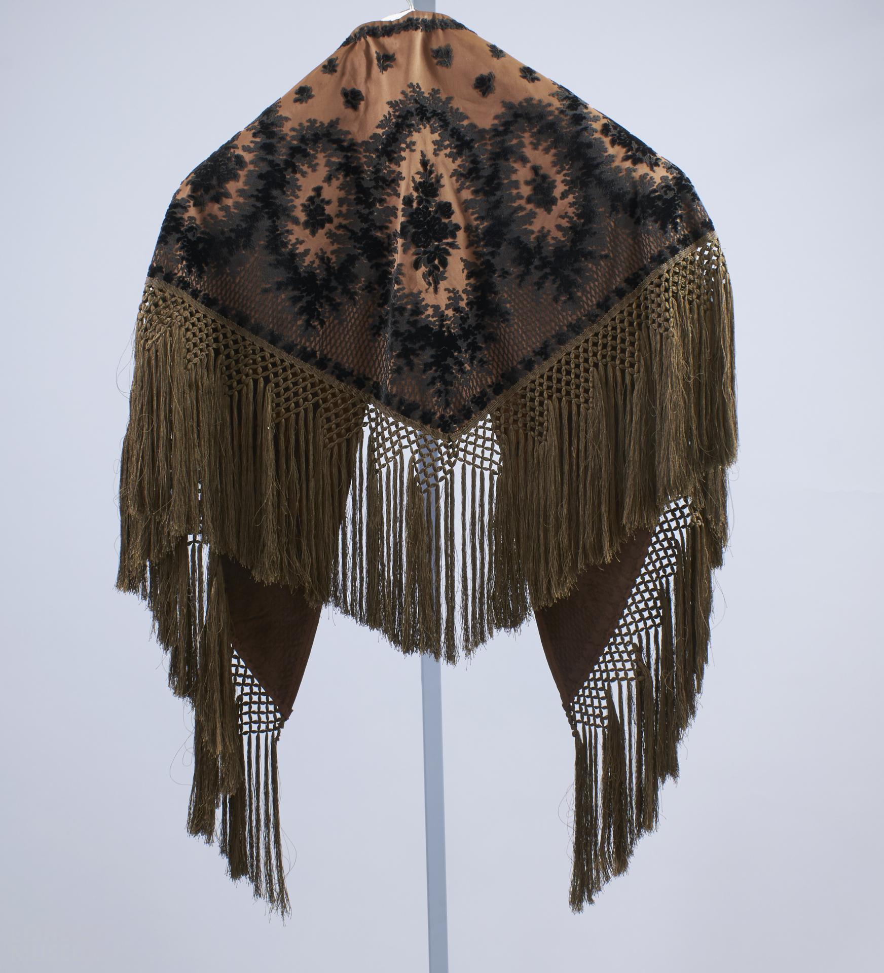Tippet from two piece dress of brown silk with intricate patterns of raised black velvet.
