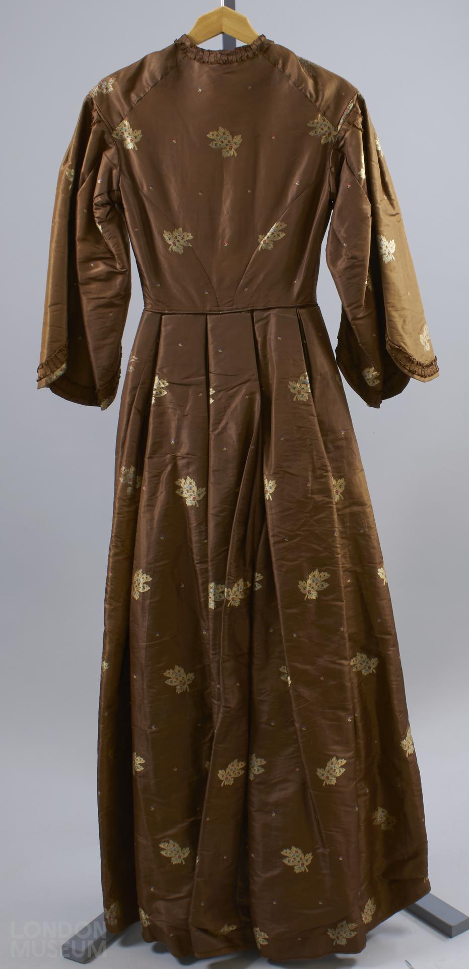 This dress is an excellent example of the retarding of fashion away from London. Made in Edinburgh, 1868.