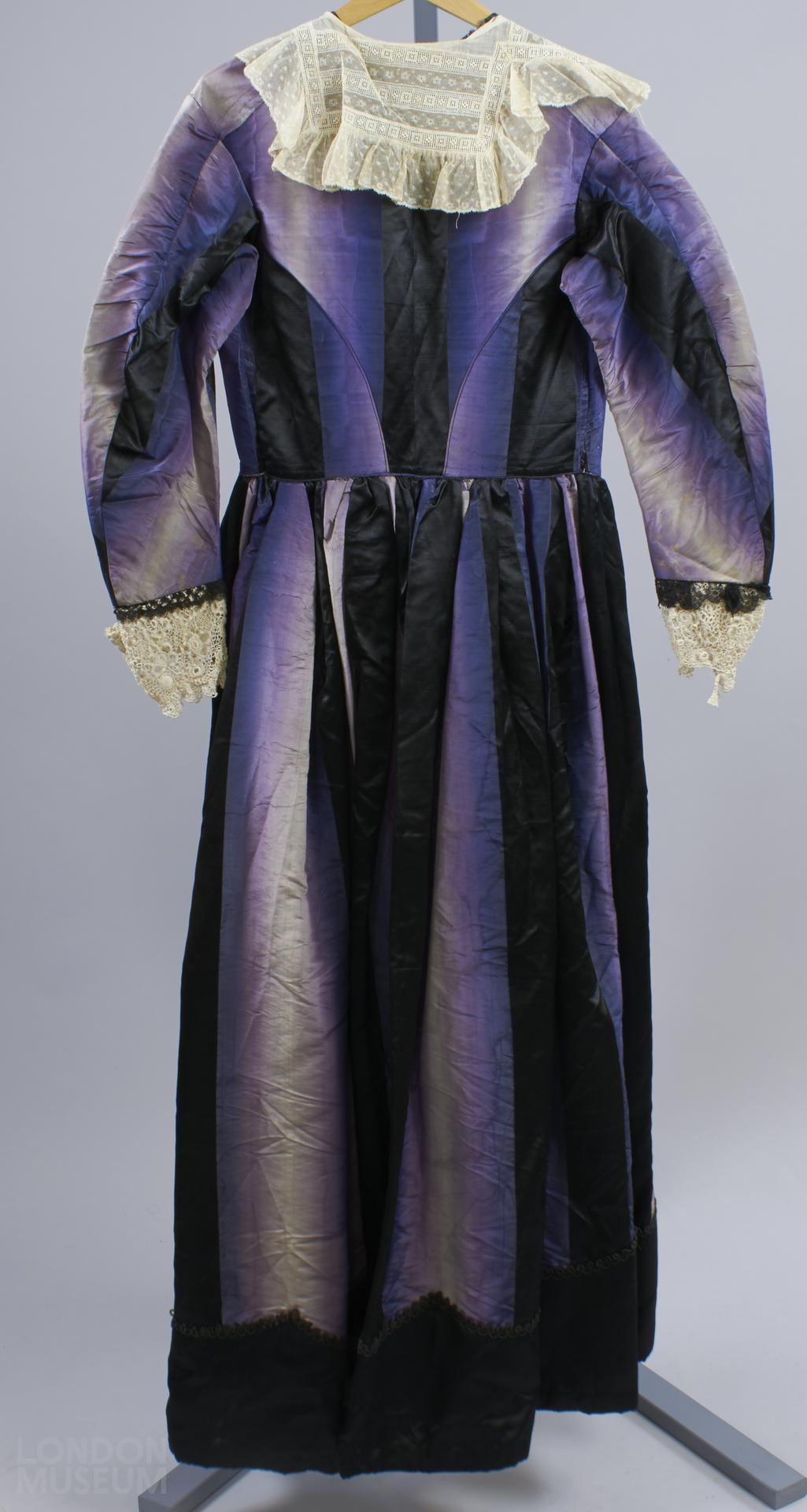 One piece dress of black silk with alternate vertical stripes of shaded purple moiré. White lace flounce at neck and crochet cuffs. Crinoline with full skirt gathered at waist. Long sleeves. Double breasted effect in front bodice by two rows of geometric-shaped buttons, one row for effect only and one for use.