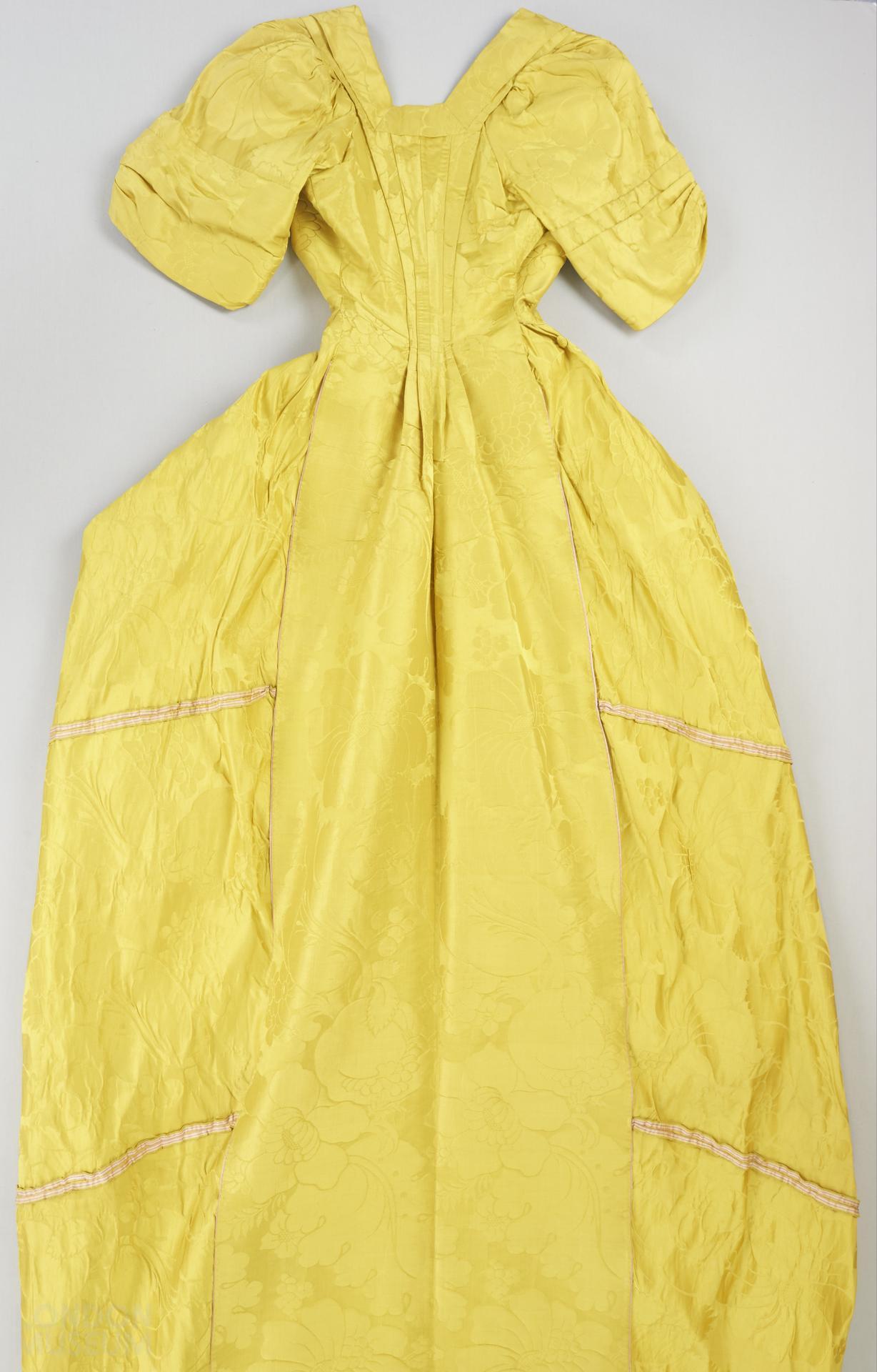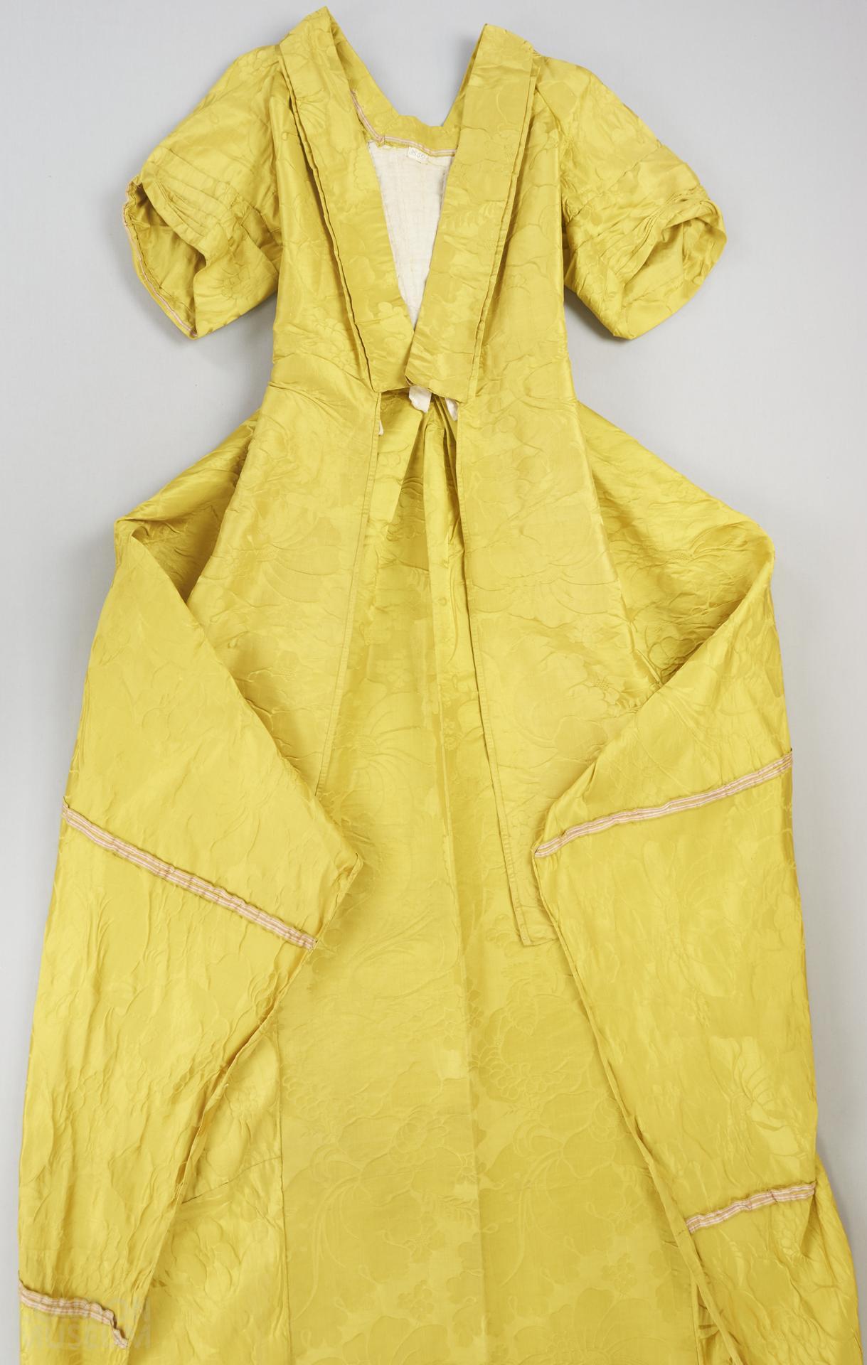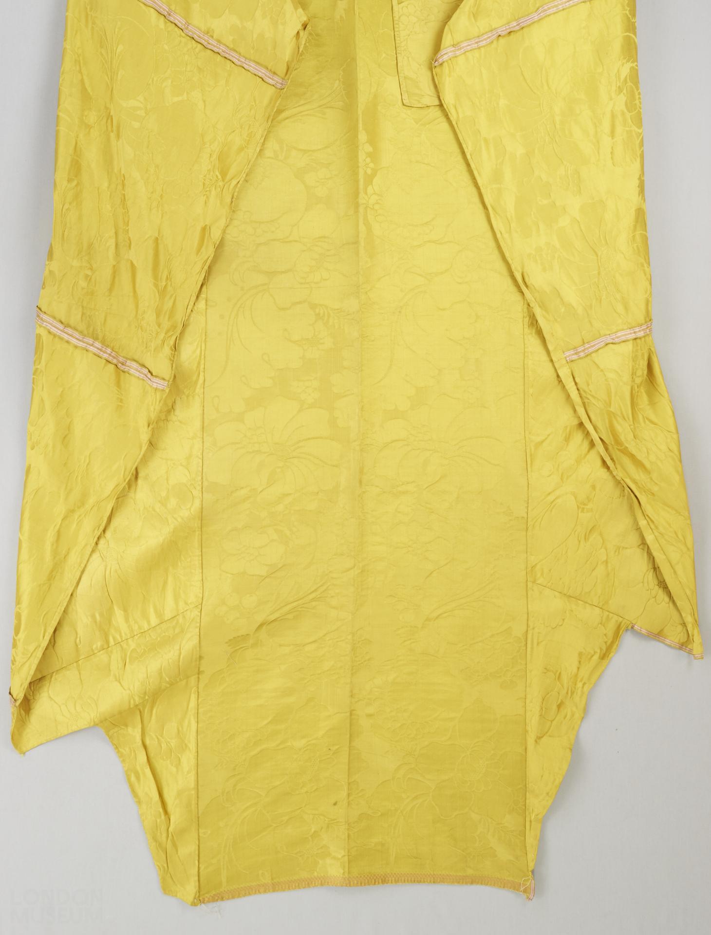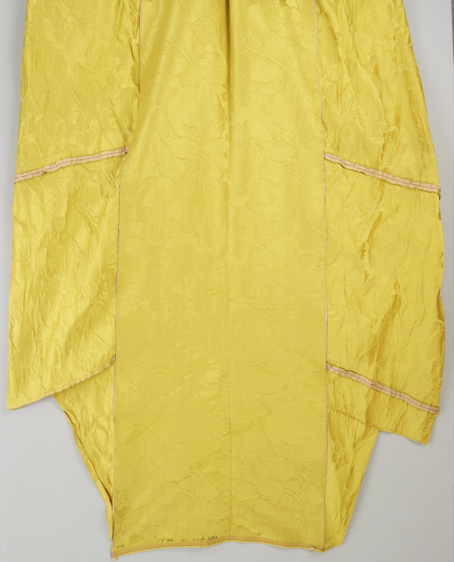 Natalie Rothstein note: the yellow silk damask is of very high quality and is unfaded. There is an end of piece with a chequerboard band and an inscription, '204 LF Watt Holl 37 1/4 yds. B de'. The final letters are smudged and could be read as R & C or G. This is not easy to interpret. It could be pattern 204; L F Watt might be the journeyman who wove it or the customer; 37 1/4 yds could be the length of the piece; while the final initials should be the name of the firm (the 1740 London Trade Directory & the length of fabric in the dress should be checked). NB. in the later Batchelor, Ham & Perigal books there are similar inscriptions which might help to elucidate this one. Check with a thread counter to see if the damask is a satin of 8 or 5, and the warp count. Width of material: 19 1/2"; selvage: 5/16" with 9 outer cords and 2 red and 1 white stripe; repeat: W. 9 3/4", L. 30 1/2".