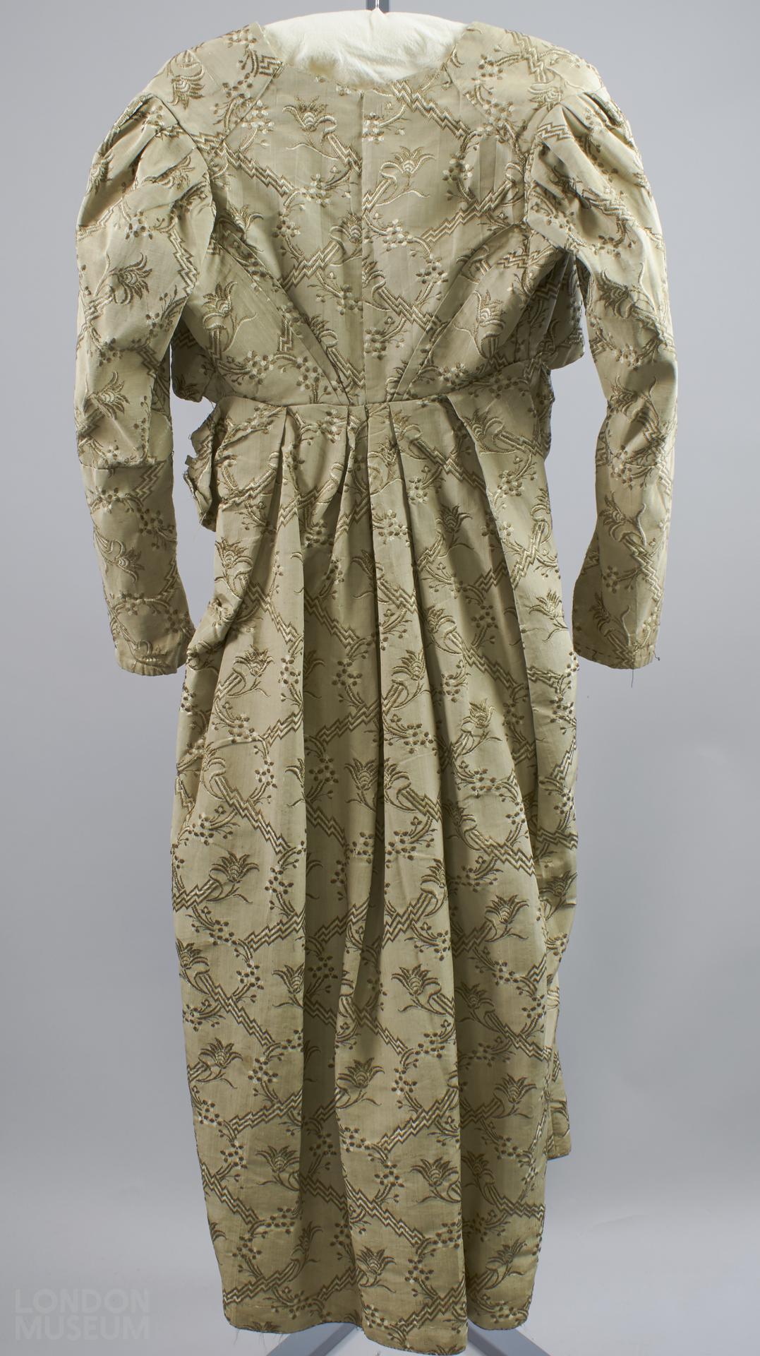 Catalogue note by Natalie Rothstein. Brown and white silk, coarsely woven with a zig-zag design and a floral motif which together form a compartment containing a stylised flower reversed each line of the repeat. Both warp and weft have alternately brown and white silk threads which are used for ground or pattern as required. Material width: 19 1/2 ins; selvage: 3/16 ins. Repeat height: 8 1/4 ins; width: 4 3/4 ins. The dress has been cut about and I find it difficult to believe that it had anything to do with Princess Charlotte. The hem is lined with buff lustring, the bodice with slightly foxed linen. The pattern can be compared with Garthwaite's in the years 1752-55 series 5989 [V&A Museum].
