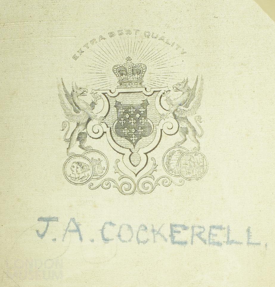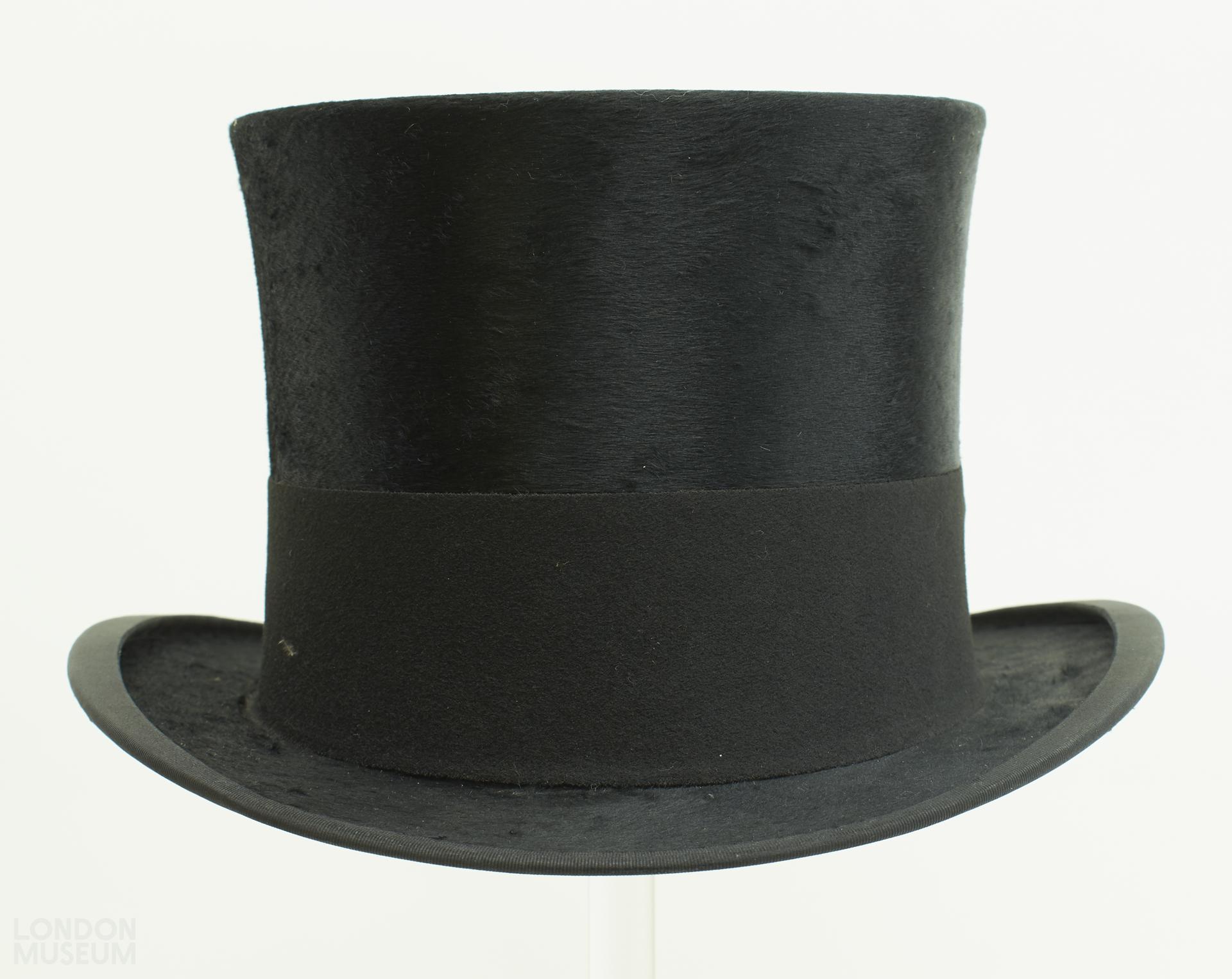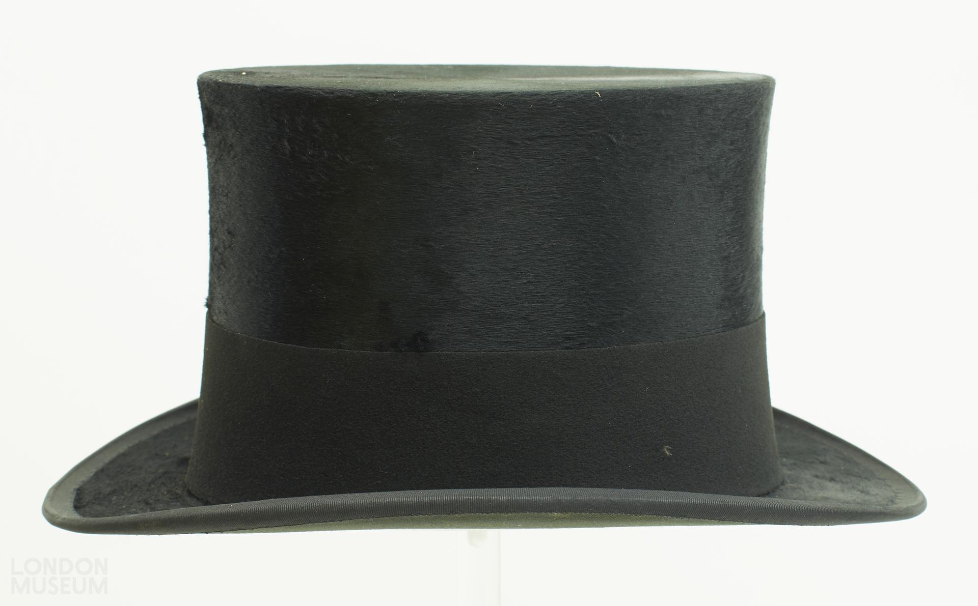 Black beaverskin top hat with black wool hatband. Underside of brim lined with black wool. Hat is lined in off-white (cream) silk, with a band of brown calfskin leather around the inside. The inside of the crown is covered with watered silk printed with a coat of arms with 'extra best quality' written above, below this the name of the owner J.A. Cockerell is written in blue ink.