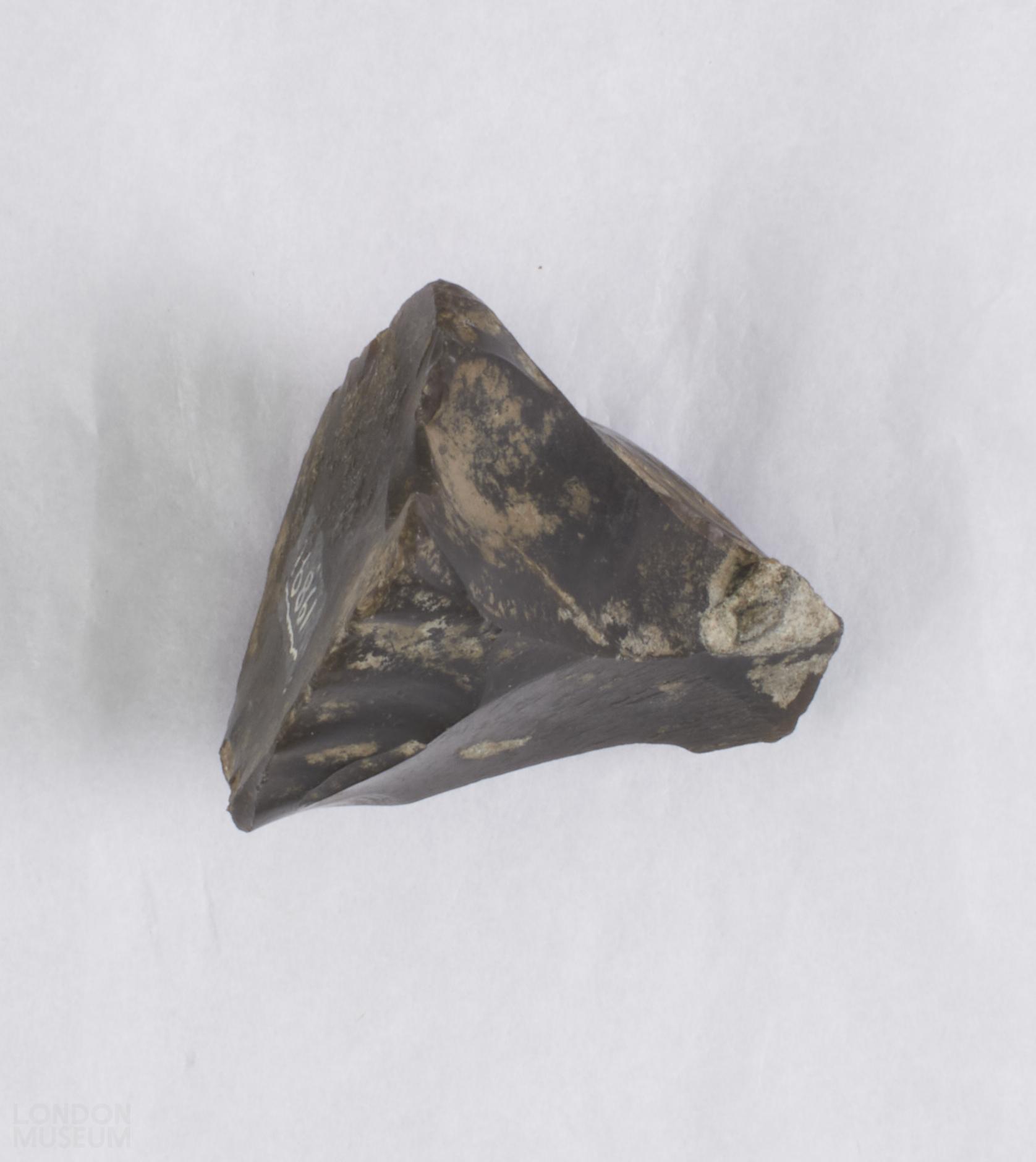 Dark brown flint core, pyramidal in shape, with blunt pointy end and worked surface. Small portions of cortex remaining.