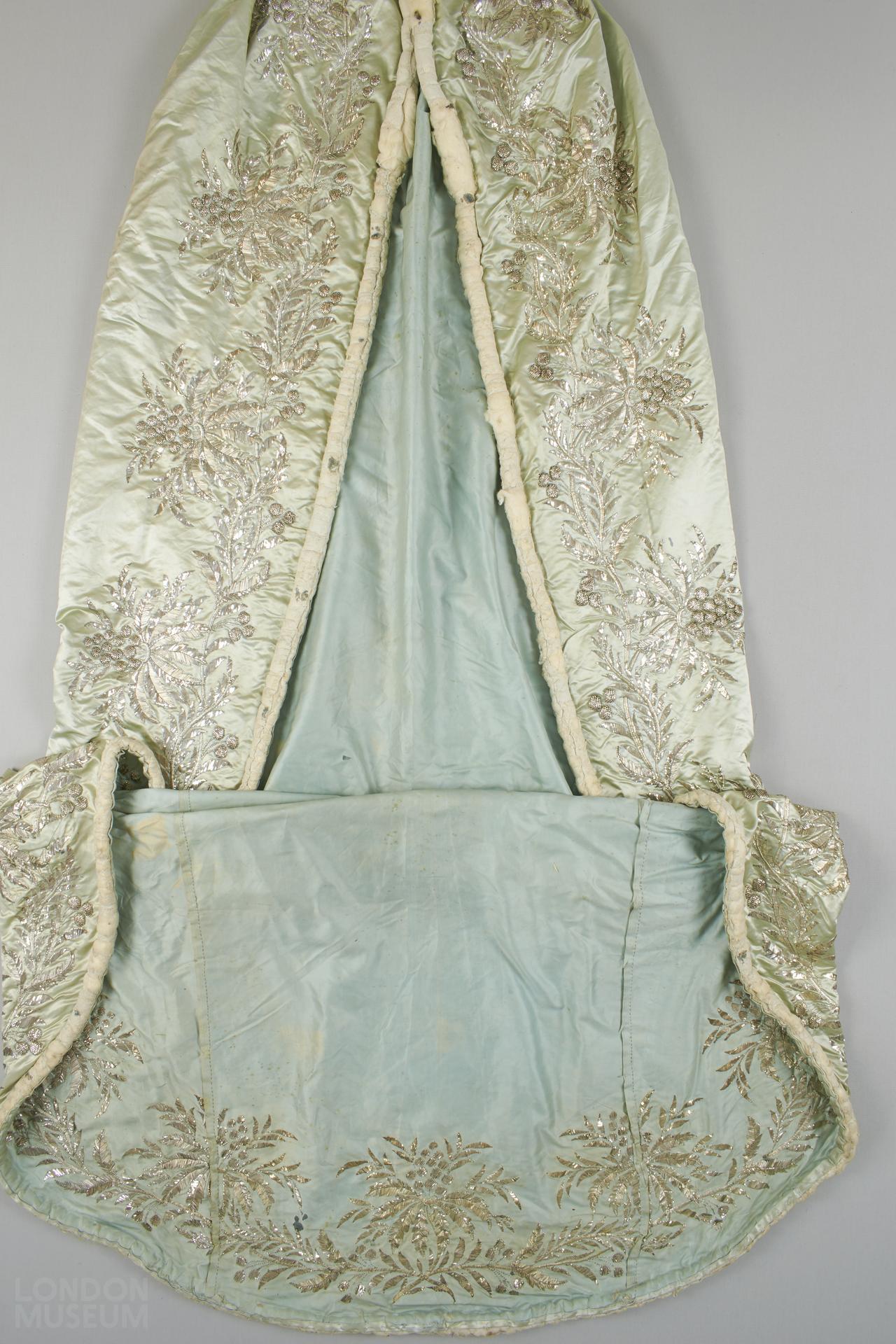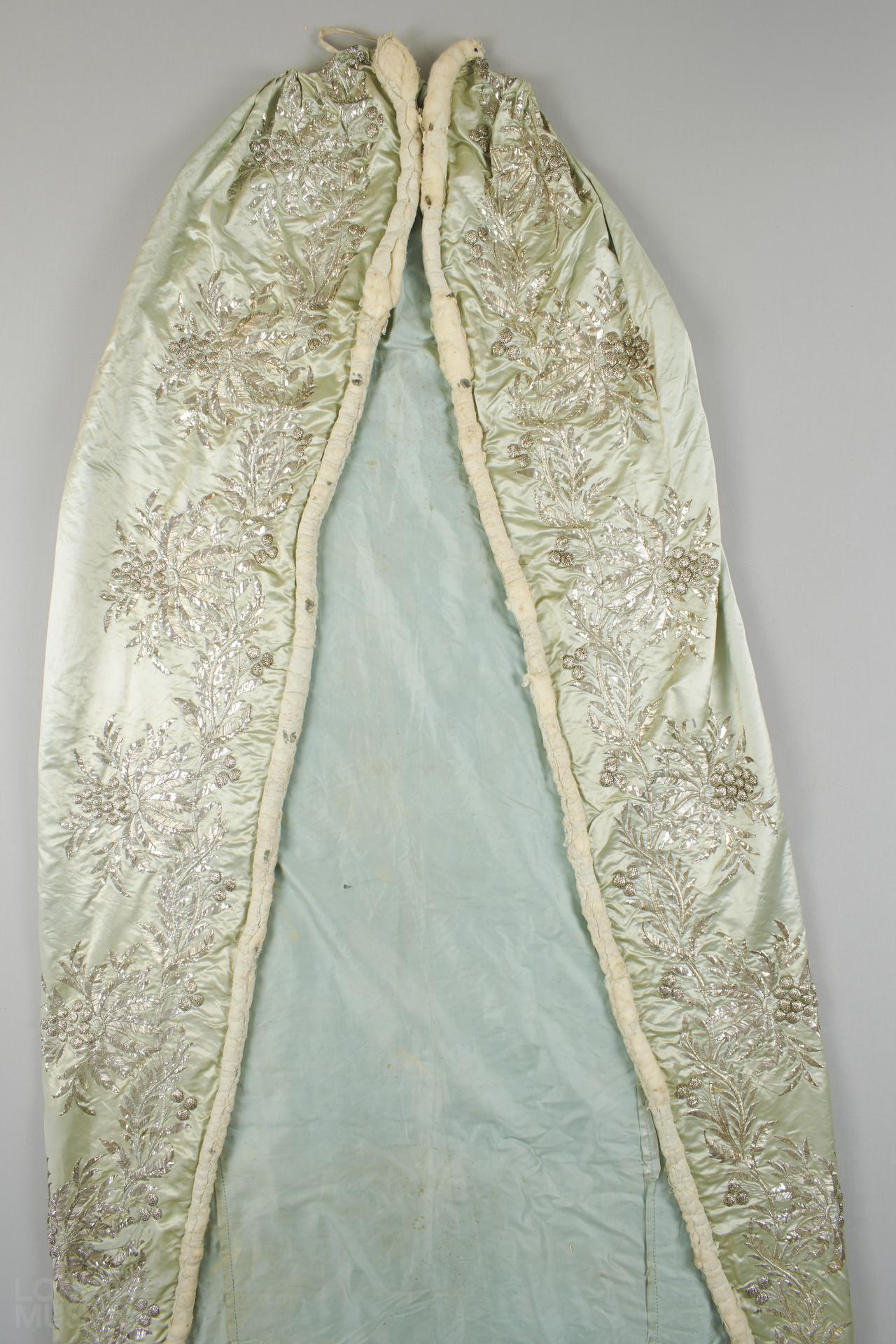 Pale blue silk satin train with deep border all way round of berry and foliage design worked in silver strip; rouleau round edges (covering missing). Short upper edge raw; ink splashes; when received the rouleau wadding was covered with cotton wool marked with ink to resemble ermine - presumably for fancy dress use. Condition: a few tears.