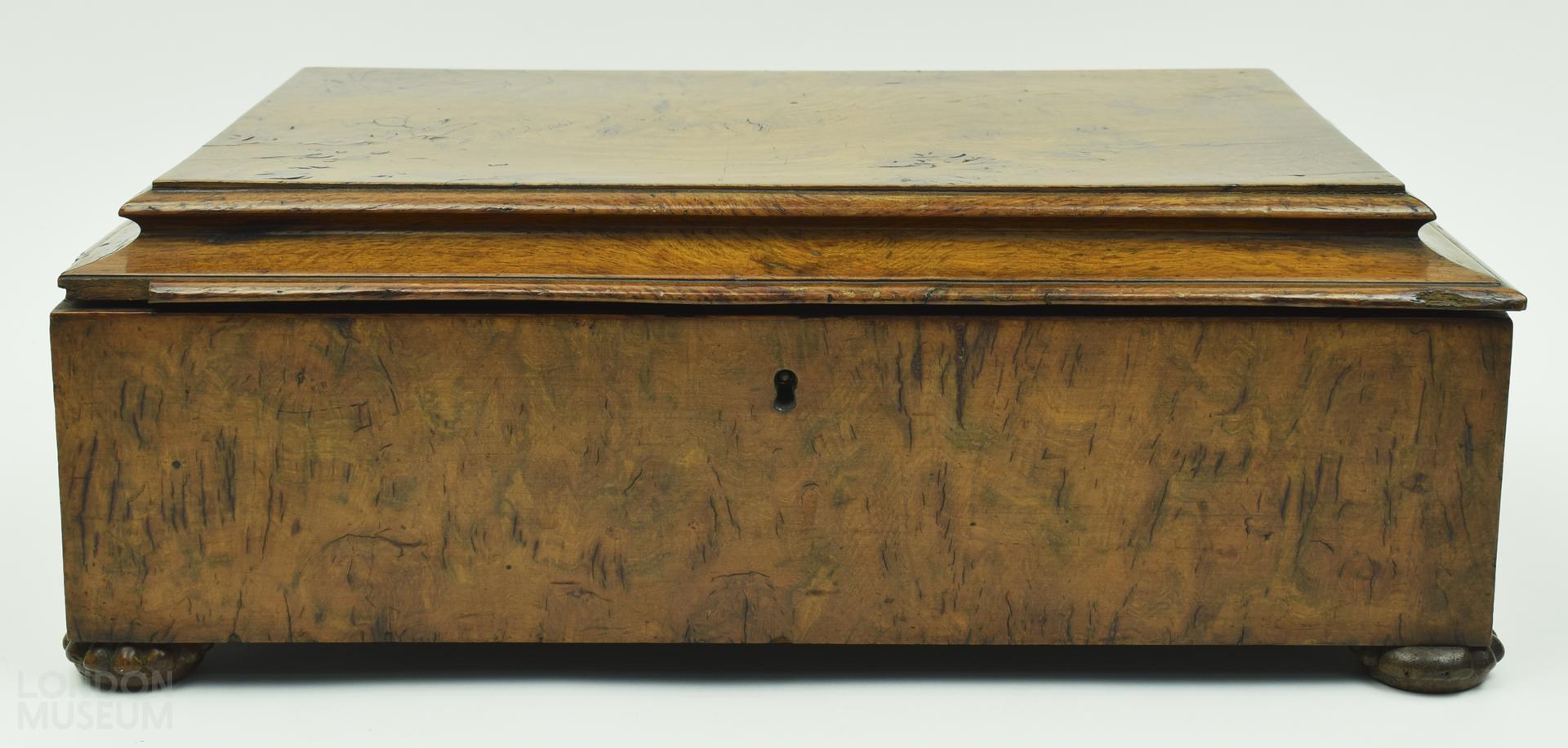 Wooden work box, key inside. Placard inside the box "Made by very large pollard oak from Windsor Forest". Lined in cream silk.