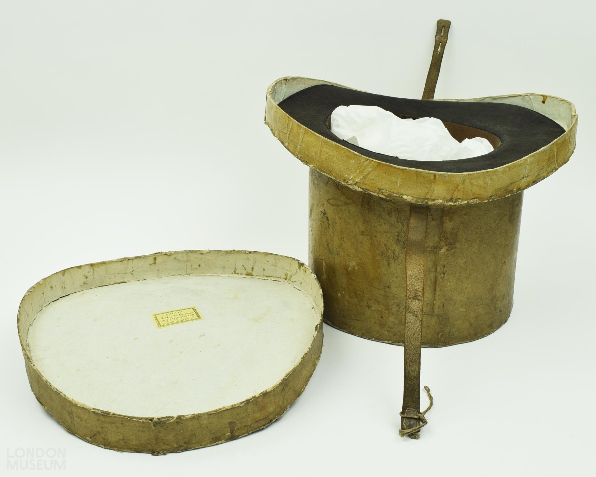 Brown hat box in the shape of a top hat; removable lid which can be secured with leather strap.