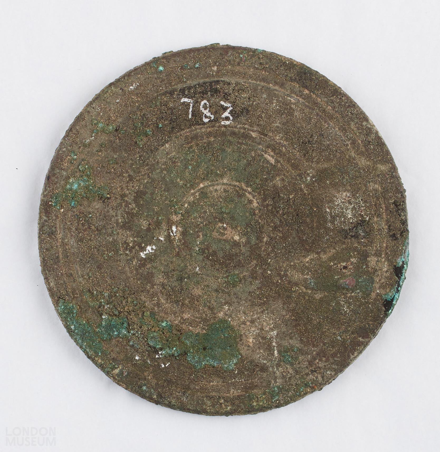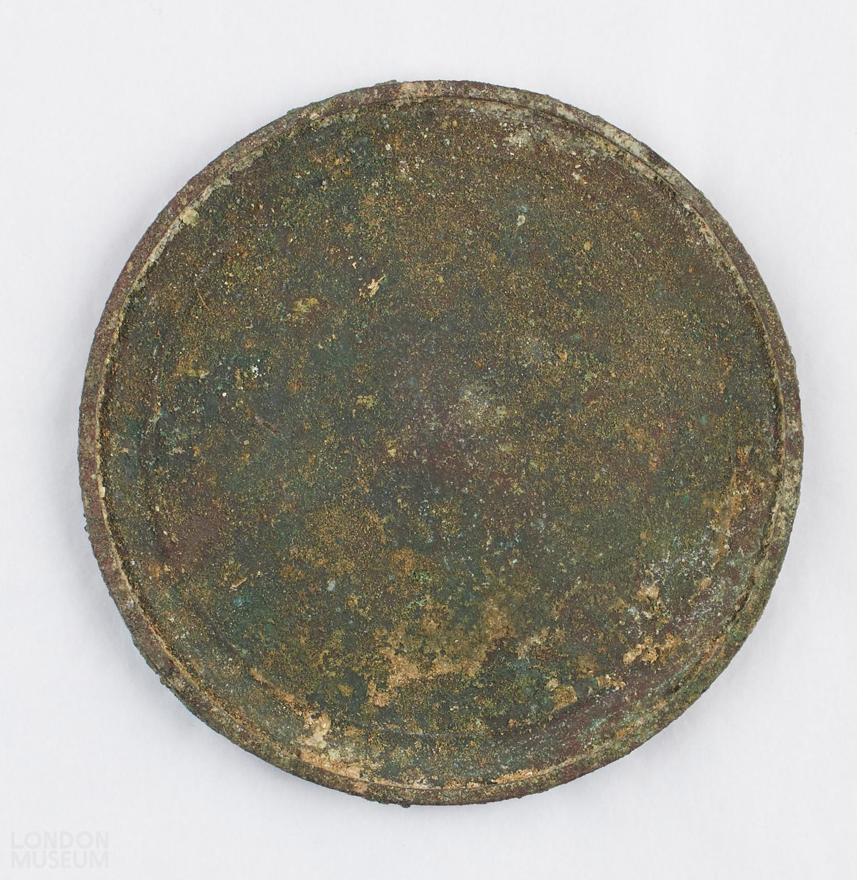 Mirror lid, bronze; decorated with concentric lines. The inside of the lid has a curved lip with ridge around the edge.