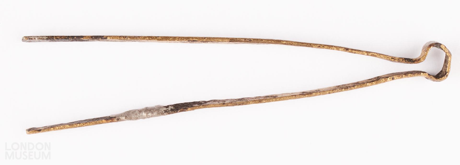 Tweezers, copper alloy, consisting of strip of alloy, bent double, with loop at bend and one arm soldered.