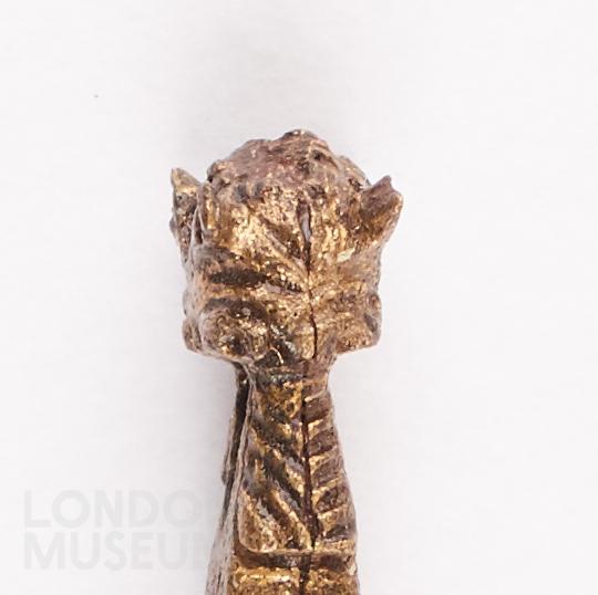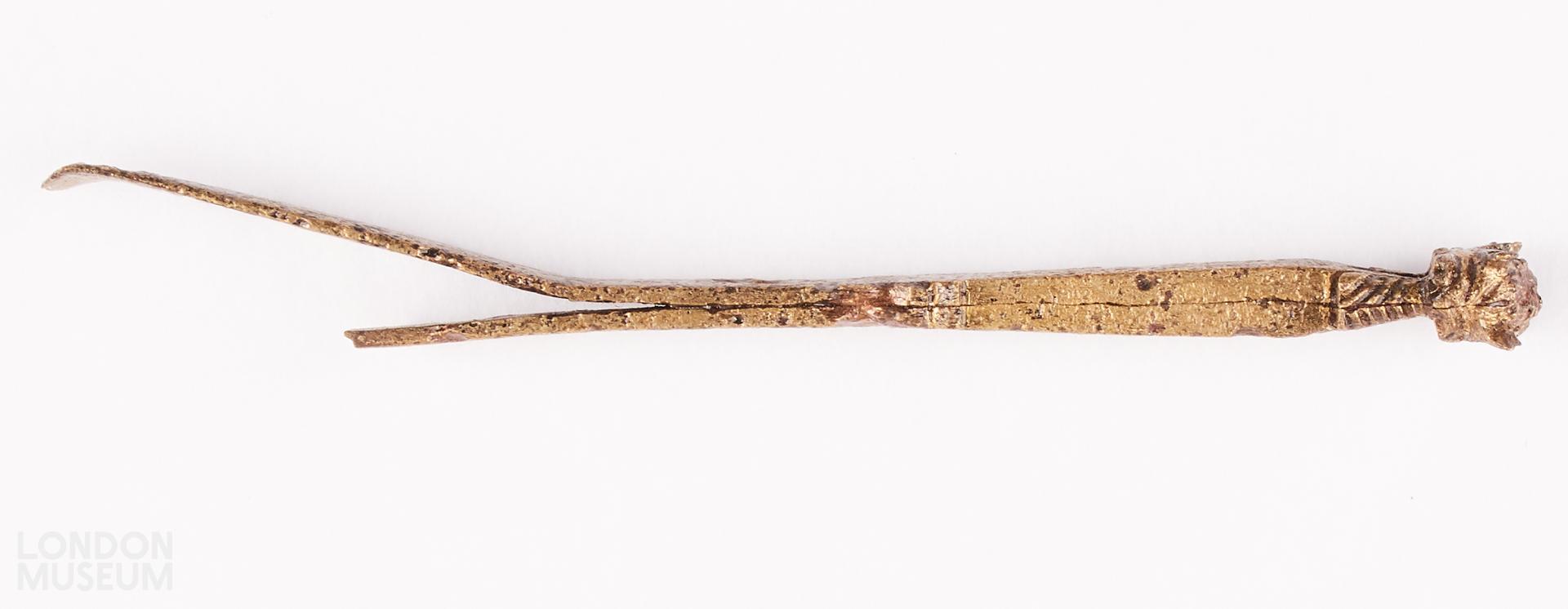 Tweezers, copper alloy, one shaft broken, ending in a knob decorated with two horses' heads, reversed.