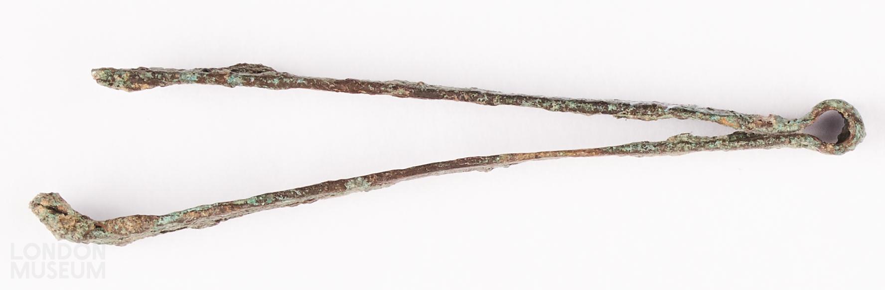 Copper alloy tweezers; with loop at bend; tip broken on one side, the other perforated with a small hole.