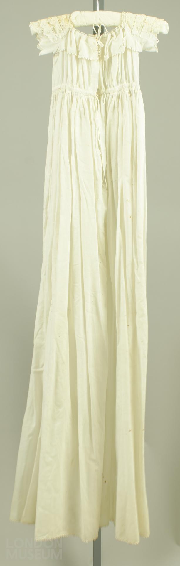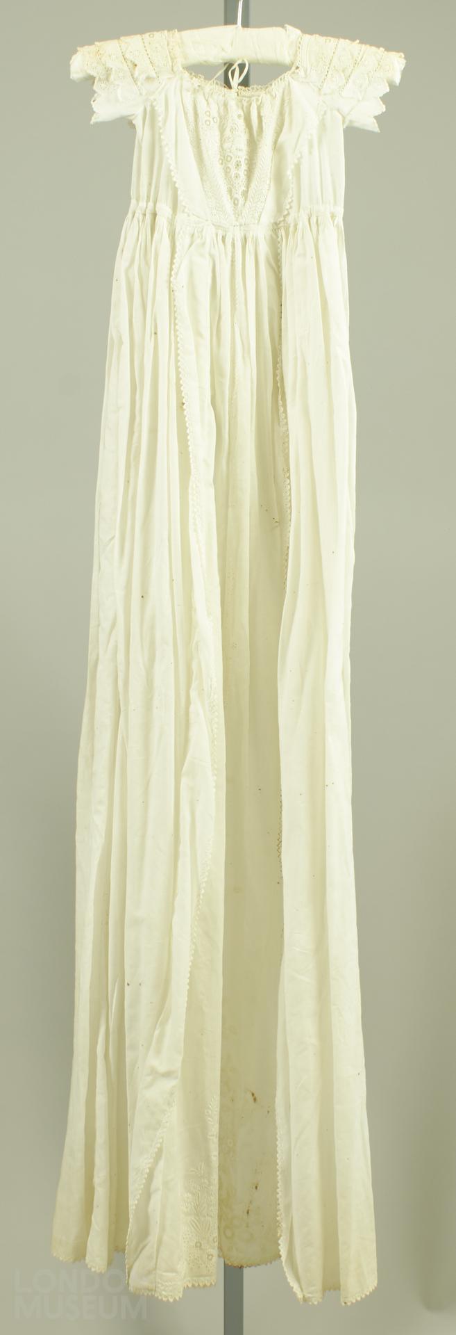 Infant's white linen christening robe. The bodice pleated on to the skirt, with an embroidered panel down the front. Embroidery at the bodce and shoulders. Tie string at the back collar and waist for fastening.