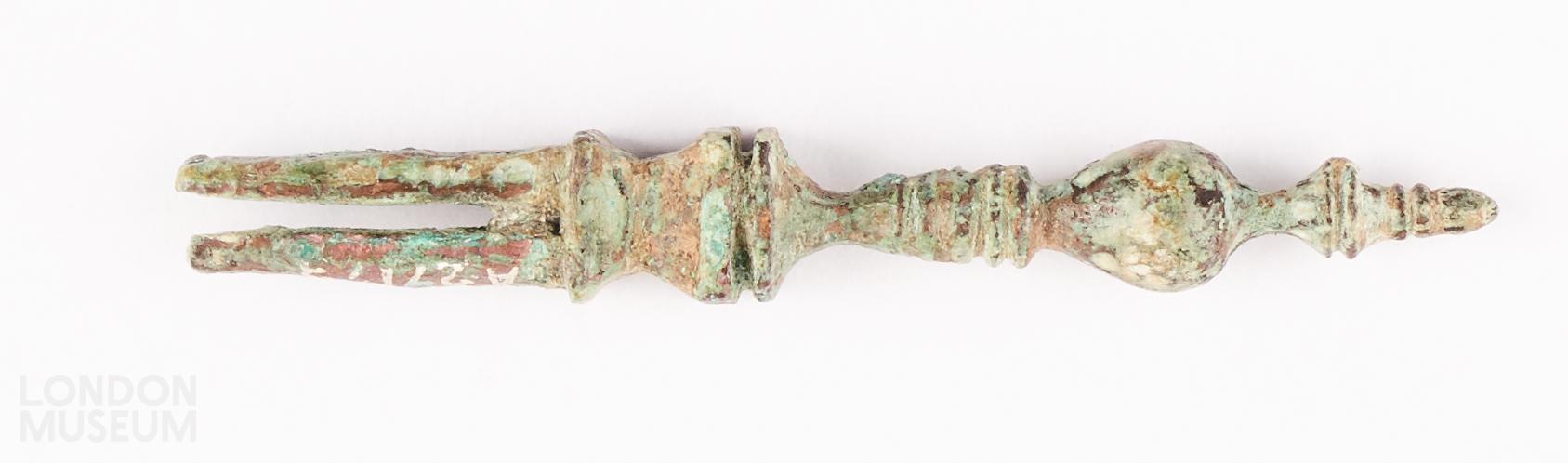 Handle of copper alloy tweezers in baluster form and split at base.