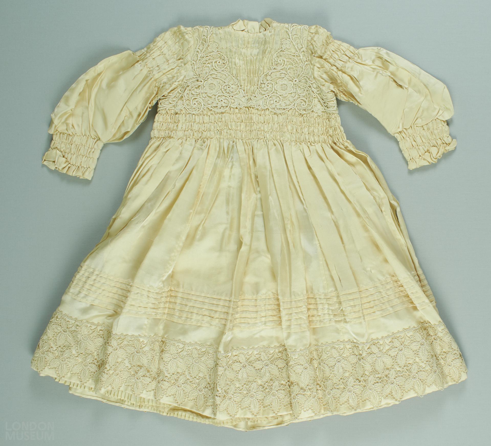 Child's frock of off-white (cream) silk, lined with silk. Bodice is smocked at front and lower half of back. Cuffs and tops of sleeves are smocked. Hem and bodice have applied lace. Hem has six narrow horizontal bands of tucking above. Centre back opening is fastened by concealed metal hooks and eyes.