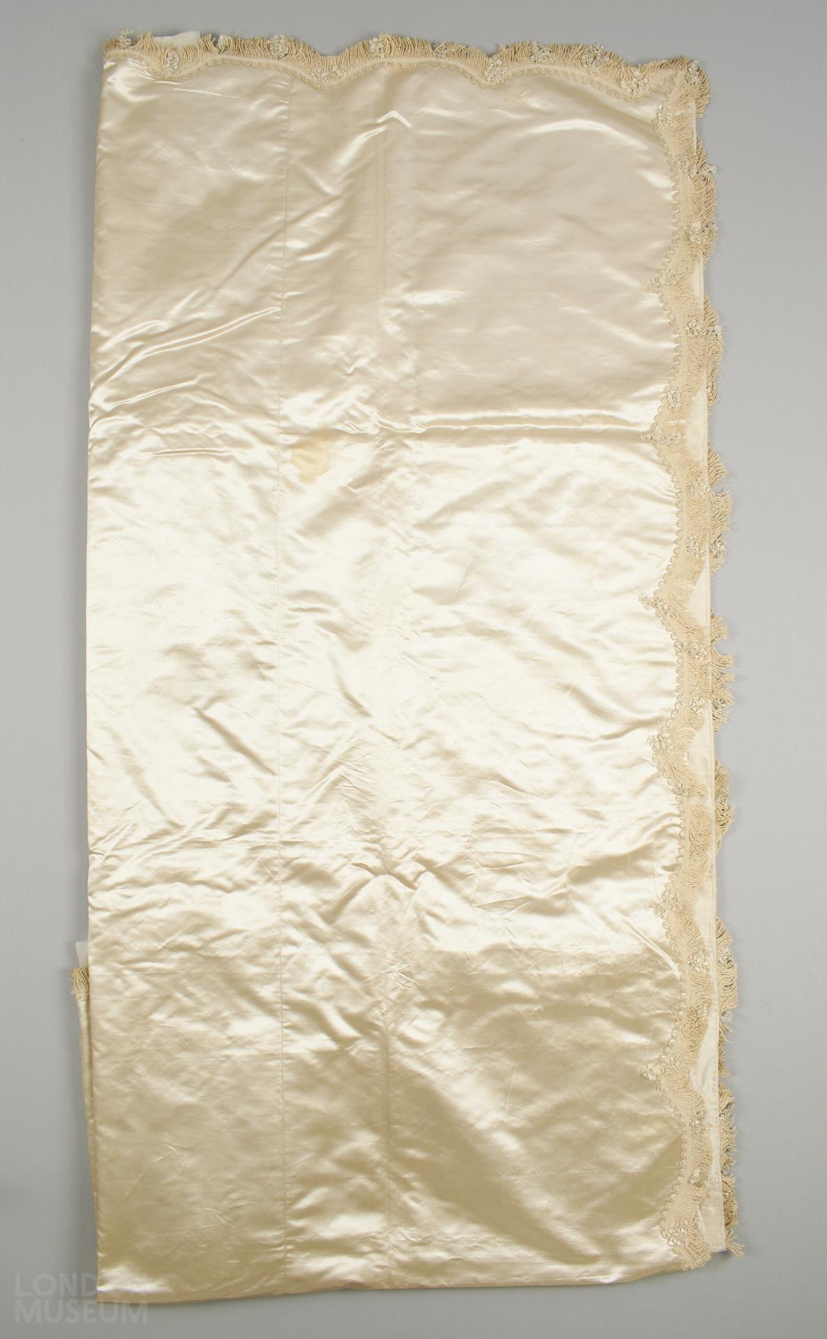Rectangular bearing cloth. Pale gold coloured / crream silk satin, edged with looped and tufted braid, lined with thin off-white (cream) silk.