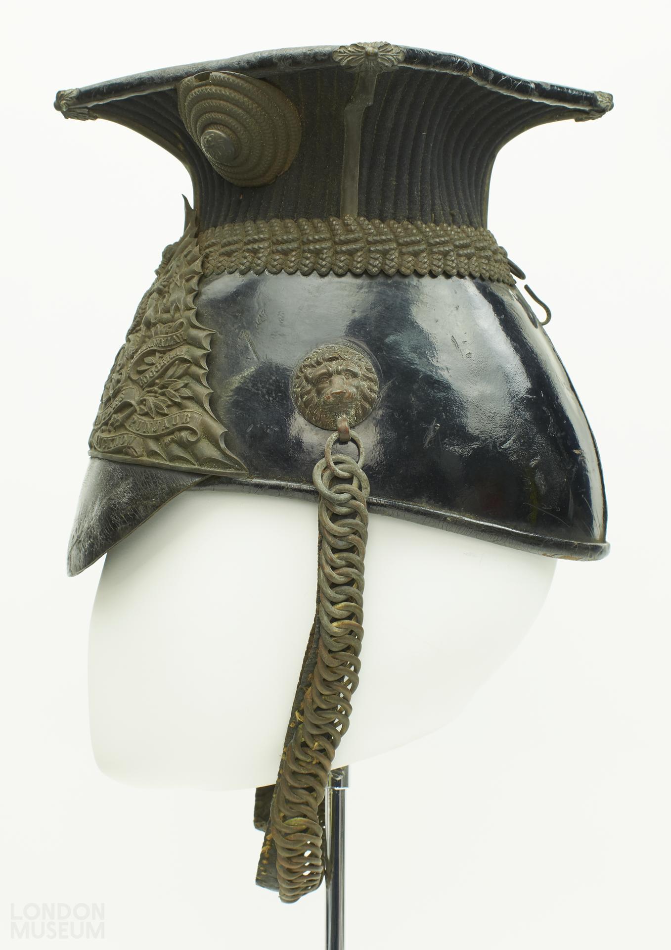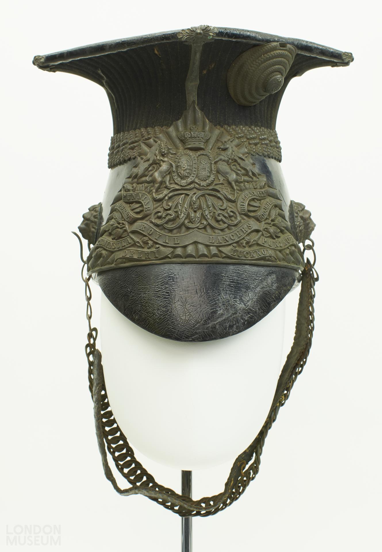 Royal Lancers military uniform hat. 19th century. Shape of crown (tapers inwards at the middle and then outwards into a square top) based on Polish 'schapka' or Czapka. Lower portion of crown made from black leather with a metal lion shaped boss, moulded in relief at either side, with a metal linked chain (chin strap?) attached to the bosses. At the front of crown is a metal regimental badge, featuring a coat of arms and lettering 'Royal Lancers' and the names of areas in India as they were know in the 19th century. Crown tapers outwards into a square stiffened top with metal oak leak decoration at the four corners. Stiff leather downwards pointing peak, with numbers ' 730 406 stamped on the underside. Crown lined in a black cotton / linen.