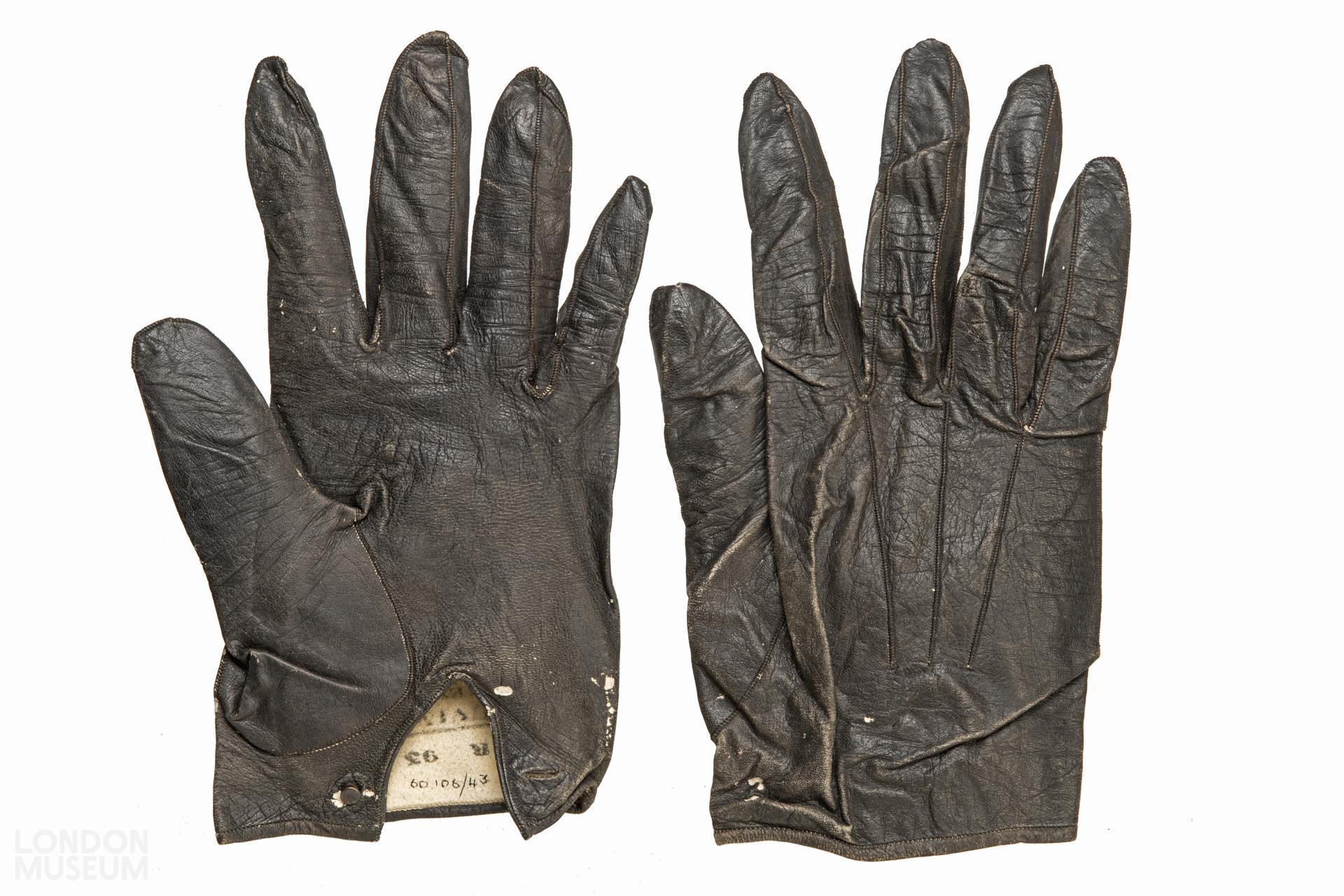 Women's heavily worn black leather gloves with one single metal stud-button at inner wrist. Numerous designer and manufacturing marks are stamped on the inside of each glove, containing information such as the name of the designer (Jouvin) and the size (8.5) amongst other letters and numbers that are illegible.