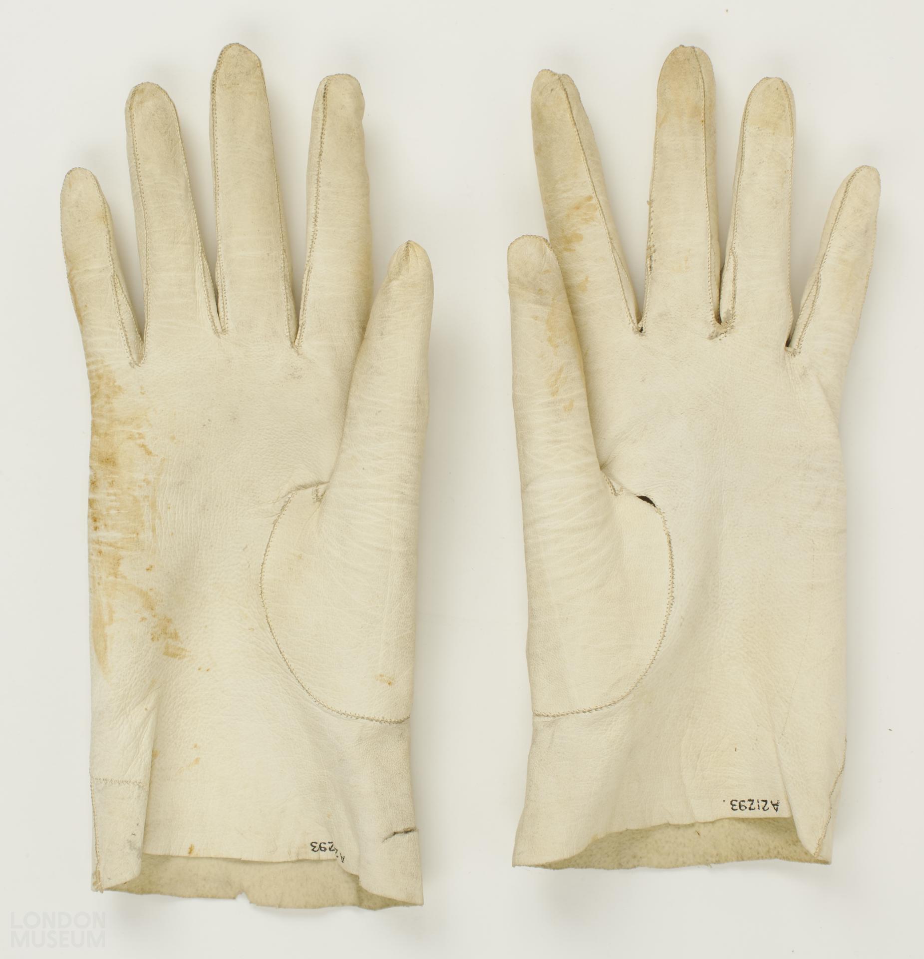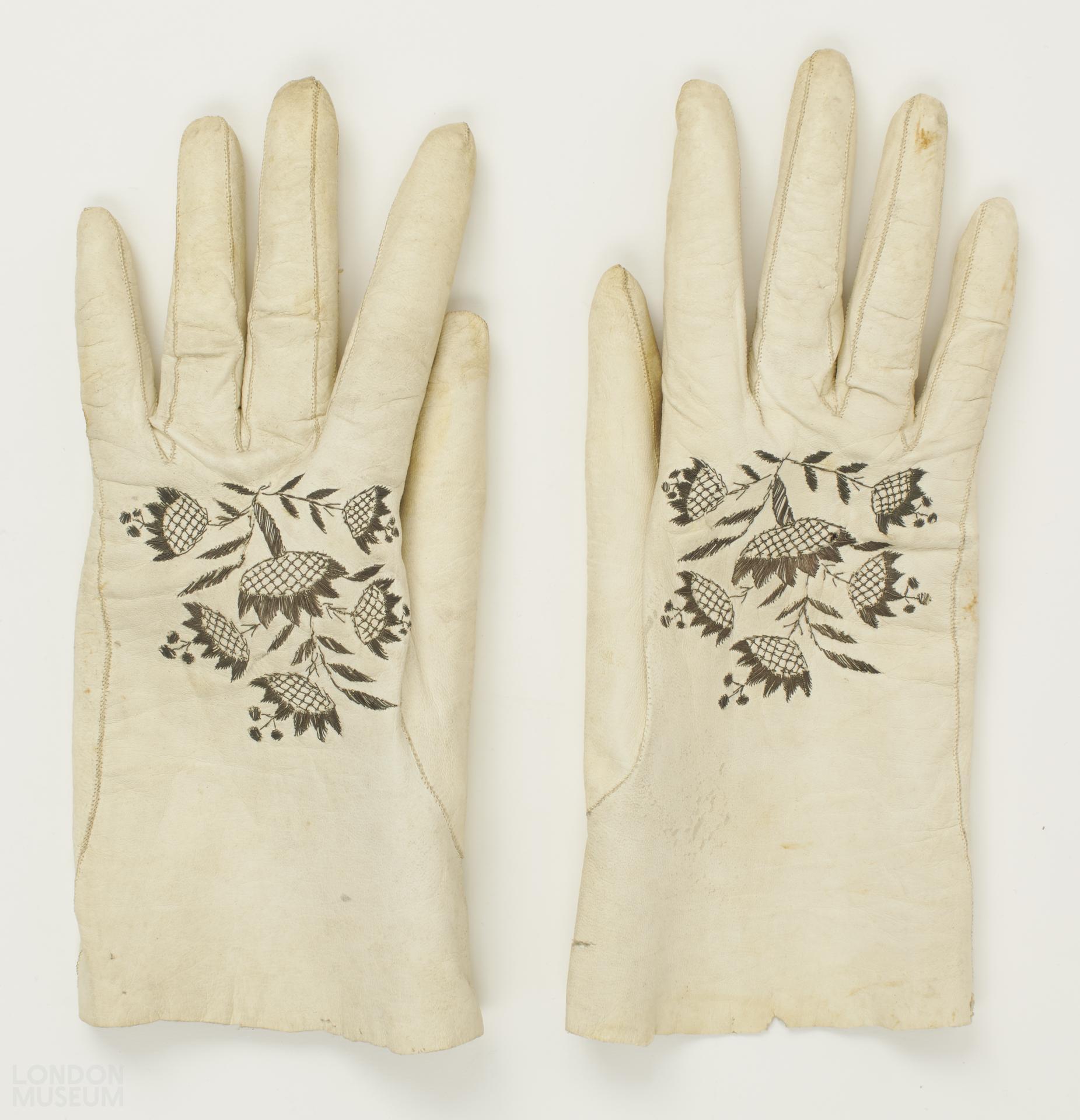 A pair of off-white beige kid leather gloves, wrist length, flower embroidered motif with brown metal threads. Handwritten inside: 'Birkbeck, 46'.