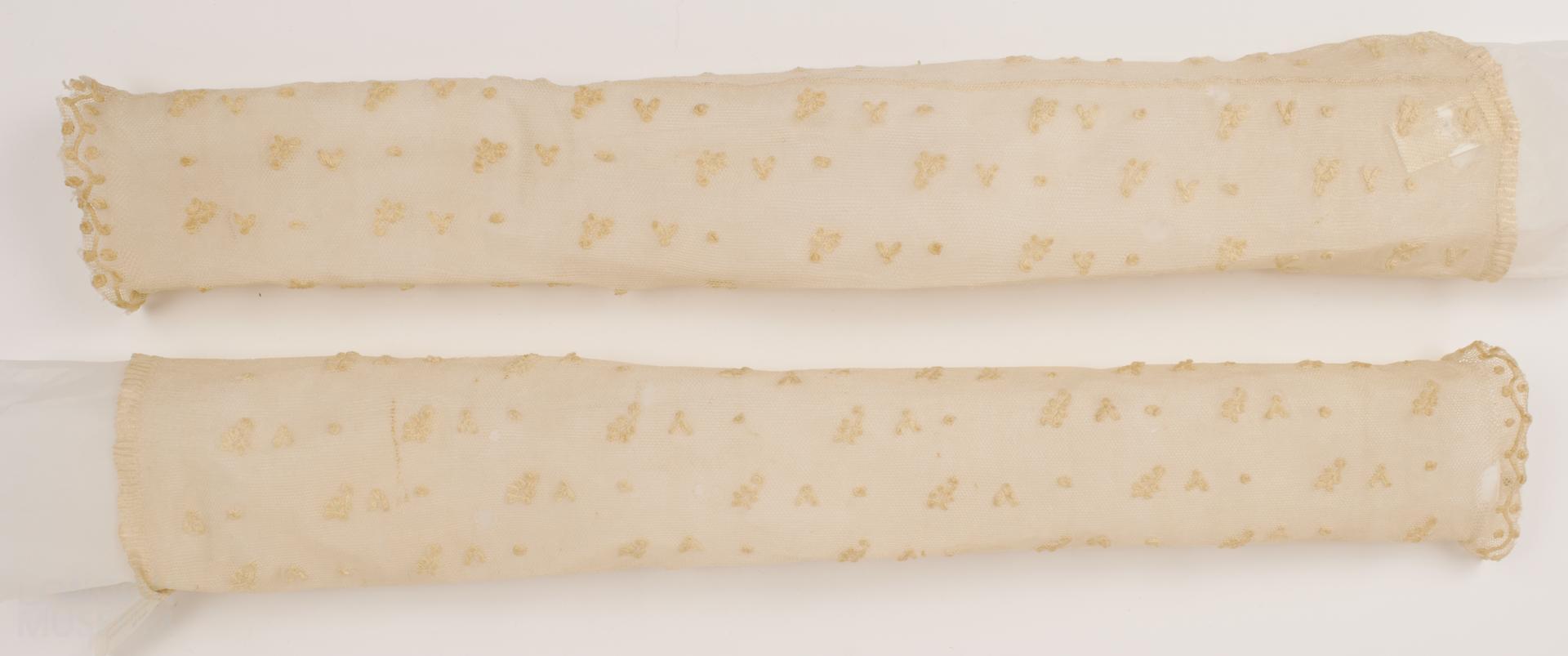 Pair of off-white silk knitted net elbow length mittens, with small off-white (cream) flower tambour work. Seamed down the middle. Knitted trimming at each end. No thumb holes, it's a tear. Construction details: seam along outer edge is fell/whip stitched. Alteration Notes: no signs of alteration.