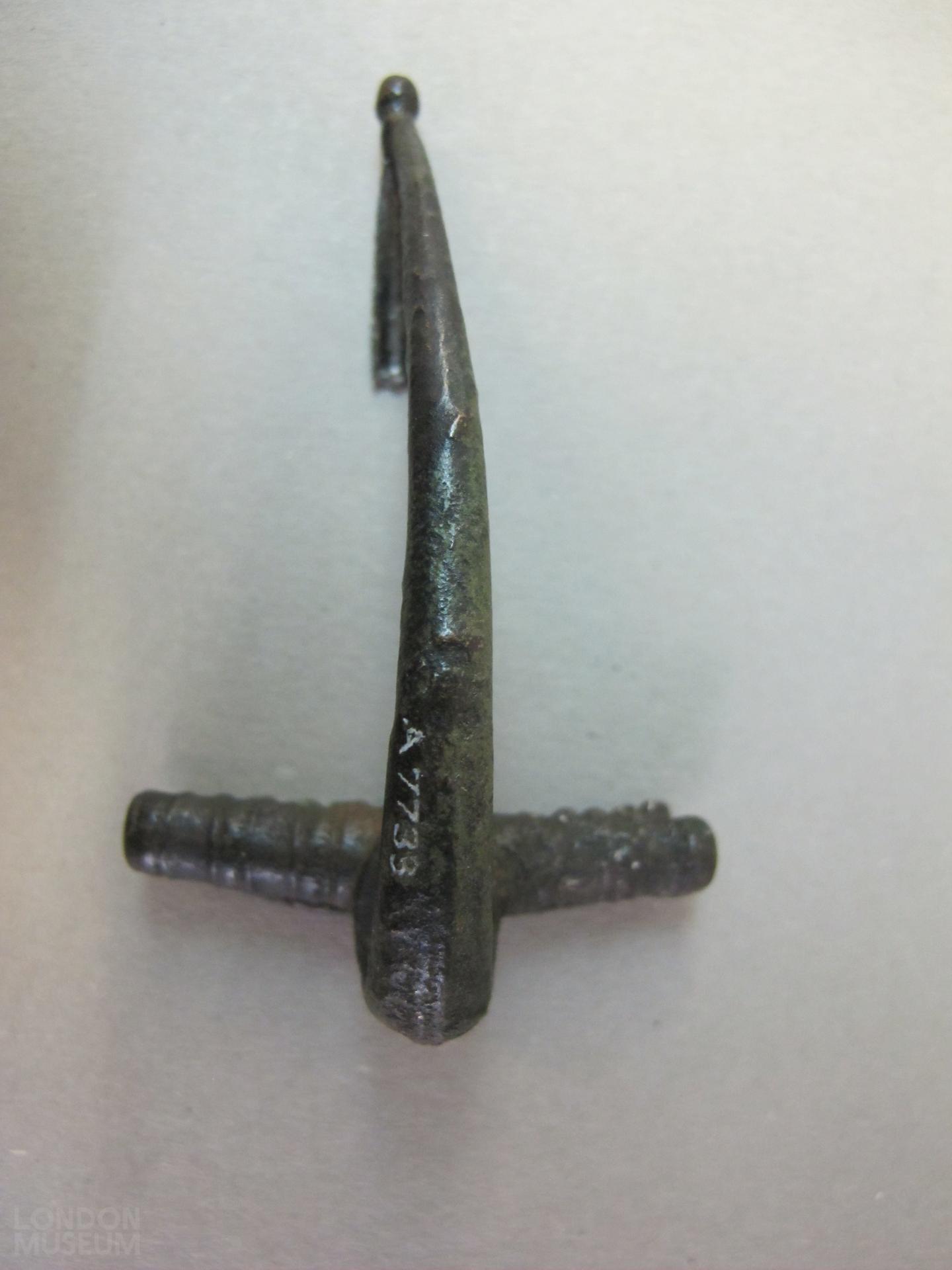 Copper alloy brooch in T shape; pin missing. Spring and semi-cylindrical cover intact, latter having three tooled decorative bands. Bow; round section; sharp kick at head ends in knob; tooled. Catchplate pierced.