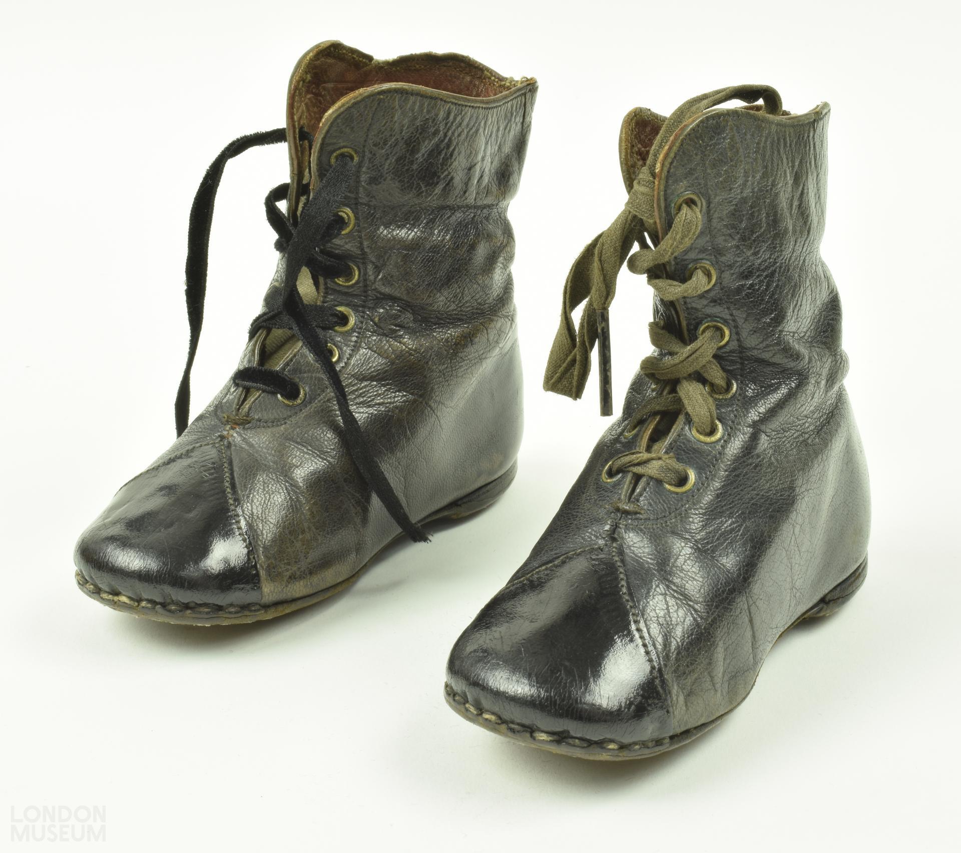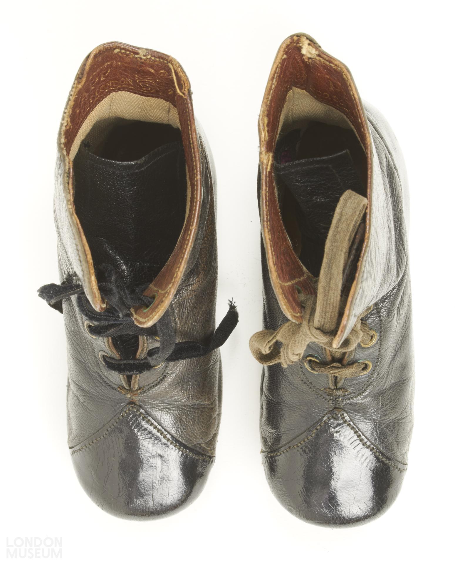 Pair of child's ankle boots made of black leather with leather soles and each with 12 metal eyelets. One boot has a black shoe lace and the other has a brown shoe lace. Inside both shoes is a maker's mark embossed on the leather 'Peter Yapp 200, 201 and 210 Sloane Street, London'.