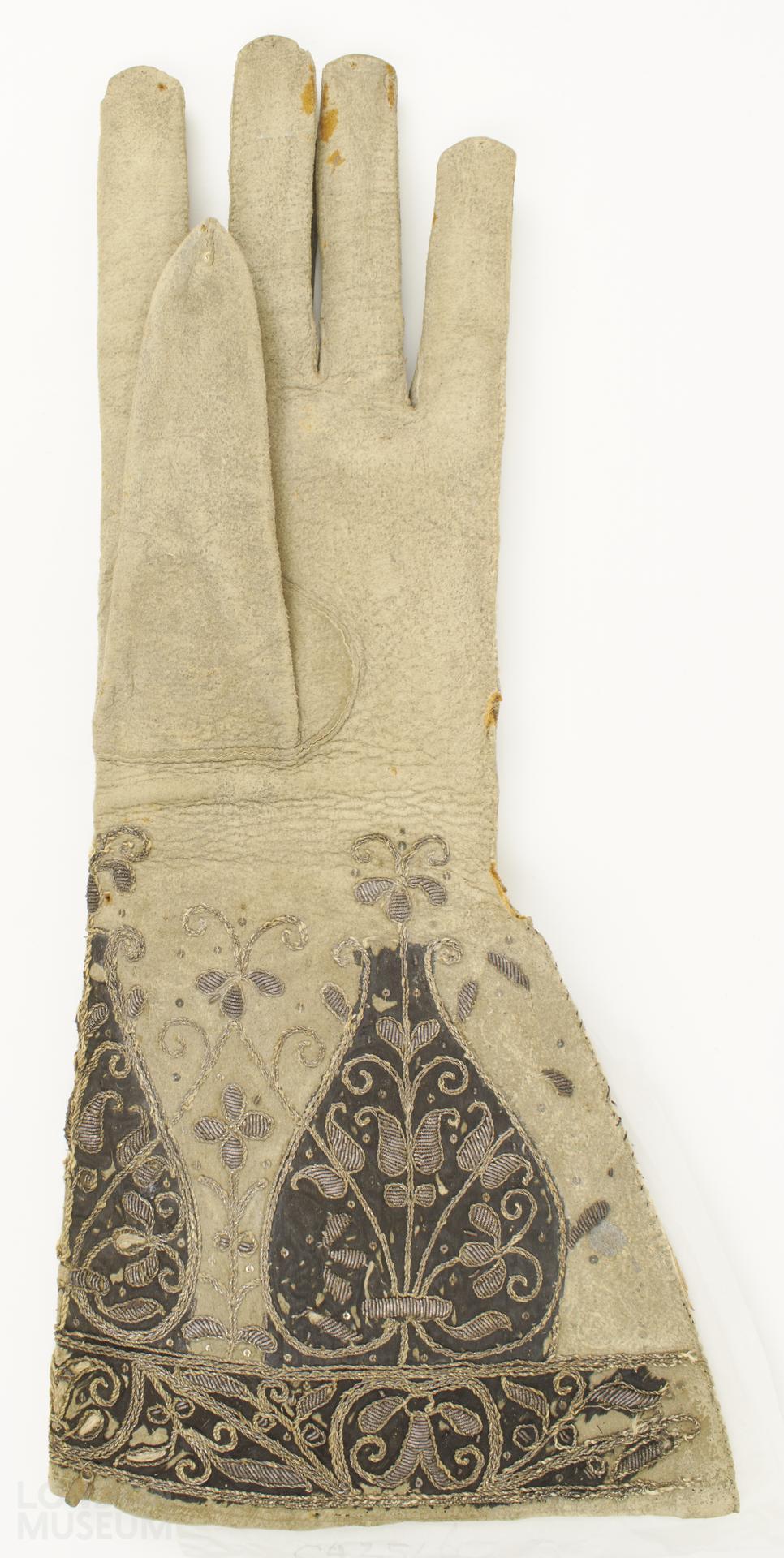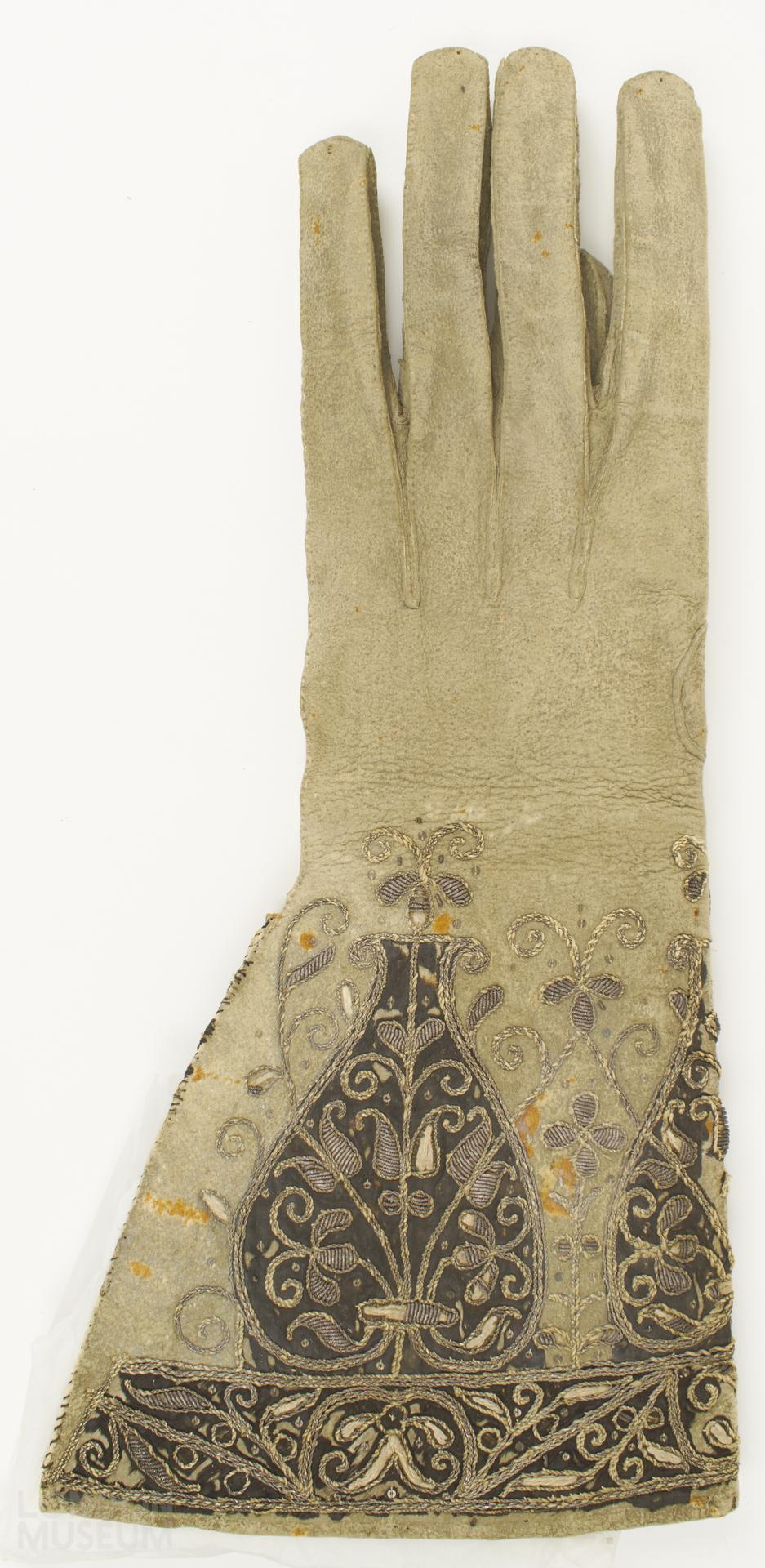 One piece gauntlet glove of lamb or sheepskin (?) dressed with flesh-side out. Cut with flare below wrist on outer (little finger) side, which is left open for last 16 cm. Finger seams continued for 5.5 cm down back as decorative feature. Gauntlet, backed with thick paper, would originally have been lined with black silk and edges trimmed with braid, fringe or lace. Gauntlet decorated along lower edge with deep border (3.5 cm) containing leaf sprays, stylised flower heads and strapwork. Above borders interlaced leafy lines form heart-shaped compartments of two different sizes extending to wrists. Within compartments floral sprigs and larger sprays. Borders and larger compartments filled with applied black silk and design worked across silk and leather in silver thread and purl in laid and couched work, partially padded. Ground scattered with small spangles. Similarly decorated pair of gauntlet gloves with applied pieces of purple silk is in V&A Museum (T.82 & A-1909)