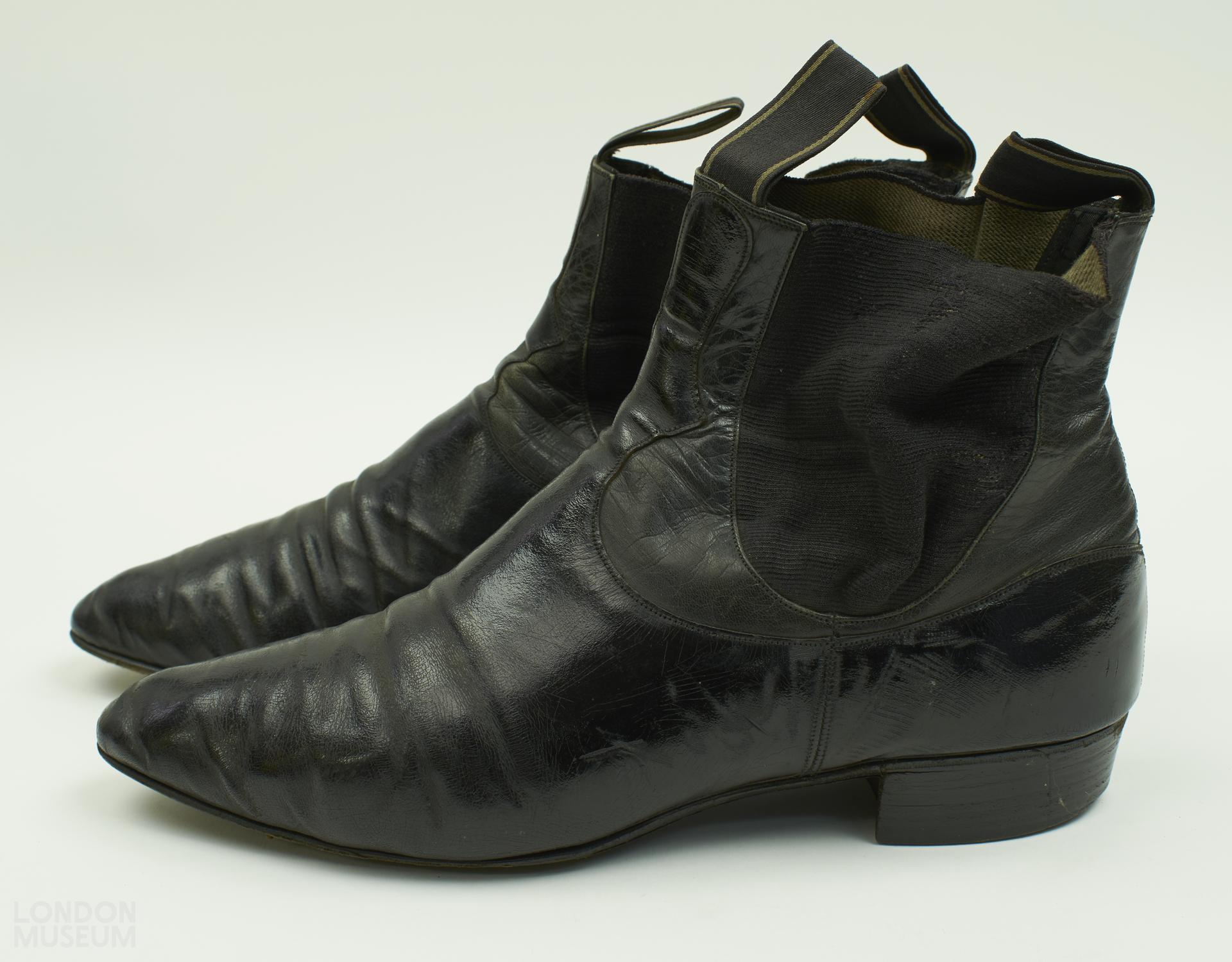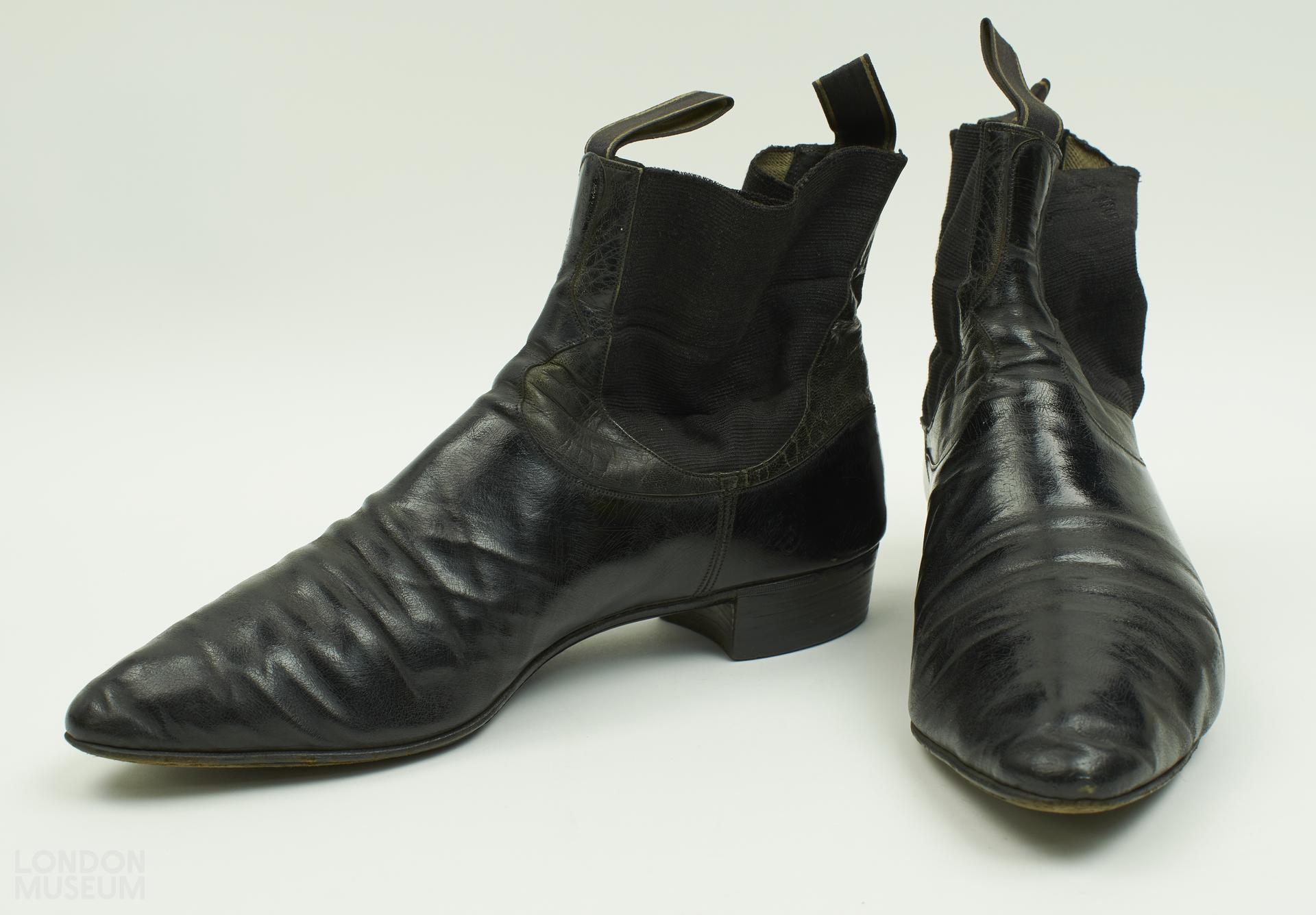 Pair of men's black patent leather boots. Pointed toes; seam and elastic gusset each side. Seamed up back of foot. Fabric tabs at front and back for puliing on. Lined with white cotton. Leather sock. Leather soles with low heels. Condition: good.