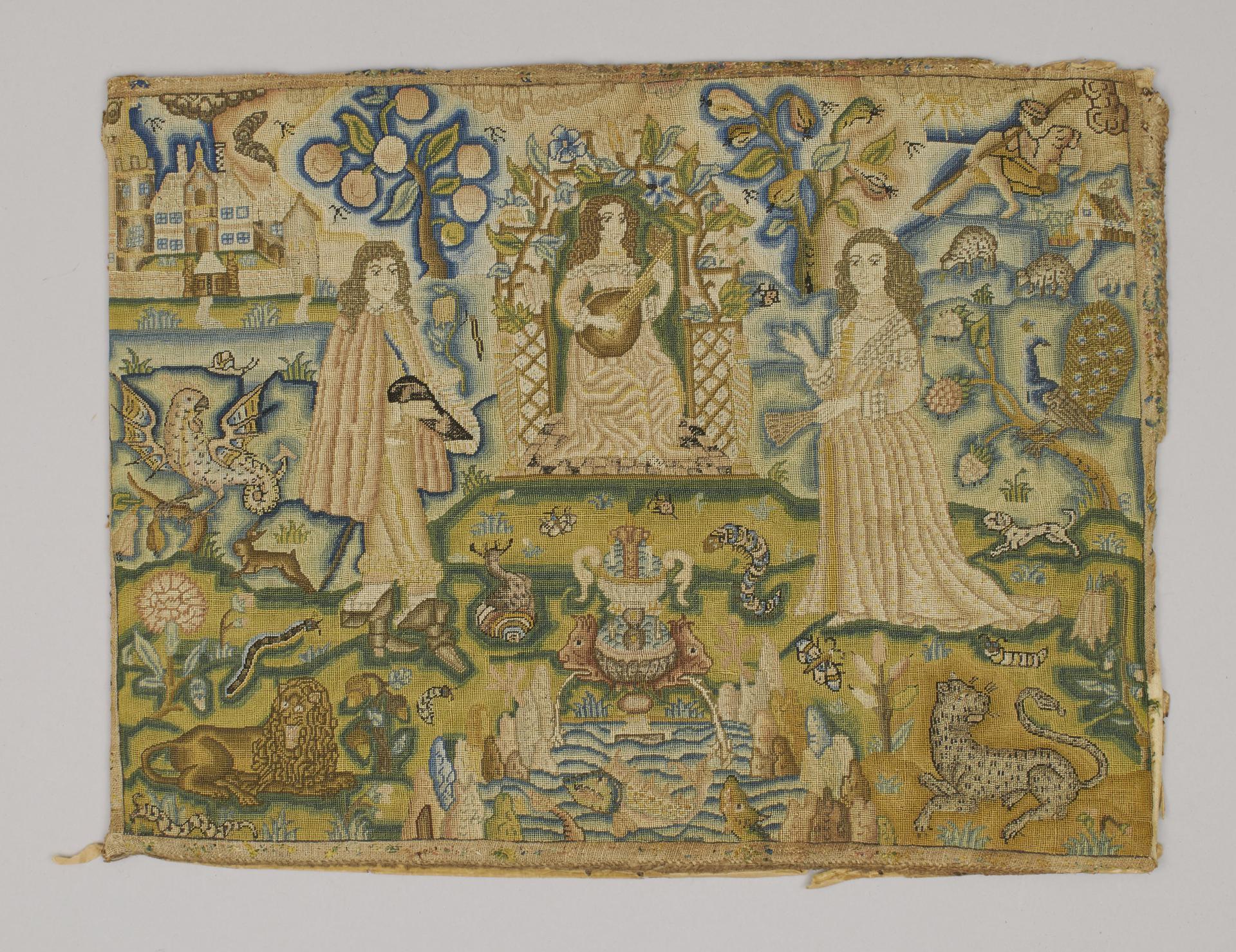 The male figure may be derived from an engraving by Hollar of ca. 1640 (see Cunnington, Seventeenth Century Costume, p. 30) and the snail from a plate in Thomas Johnson's A Book of Beasts, Birds, Flowers etc.,1630.