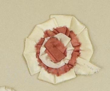 White and pink silk rosette. One of three wedding favours in the Danish colours, mounted on card. The card features a coloured gold raised label, with printed text in black ink, which reads, 'WEDDING FAVOURS IN THE DANISH COLOURS WORN IN LONDON ON THE WEDDING DAY OF KING EDWARD AND QUEEN ALEXANDRA / MARCH 10th 1863 / Presented by Miss M. Shoberl, Wimbledon'.