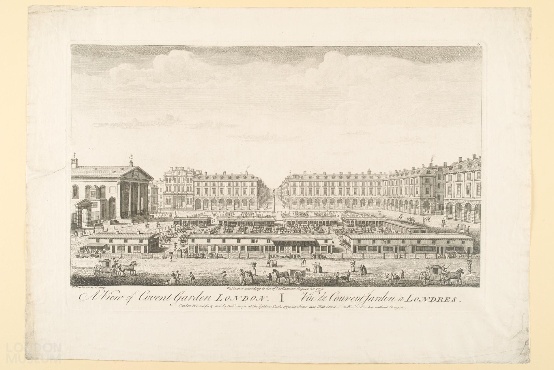 Covent Garden piazza looking north with St Paul's church to the left and market buildings and stalls in the centre. No. 6 in a series. Parallel titles in French. Same as A16683.