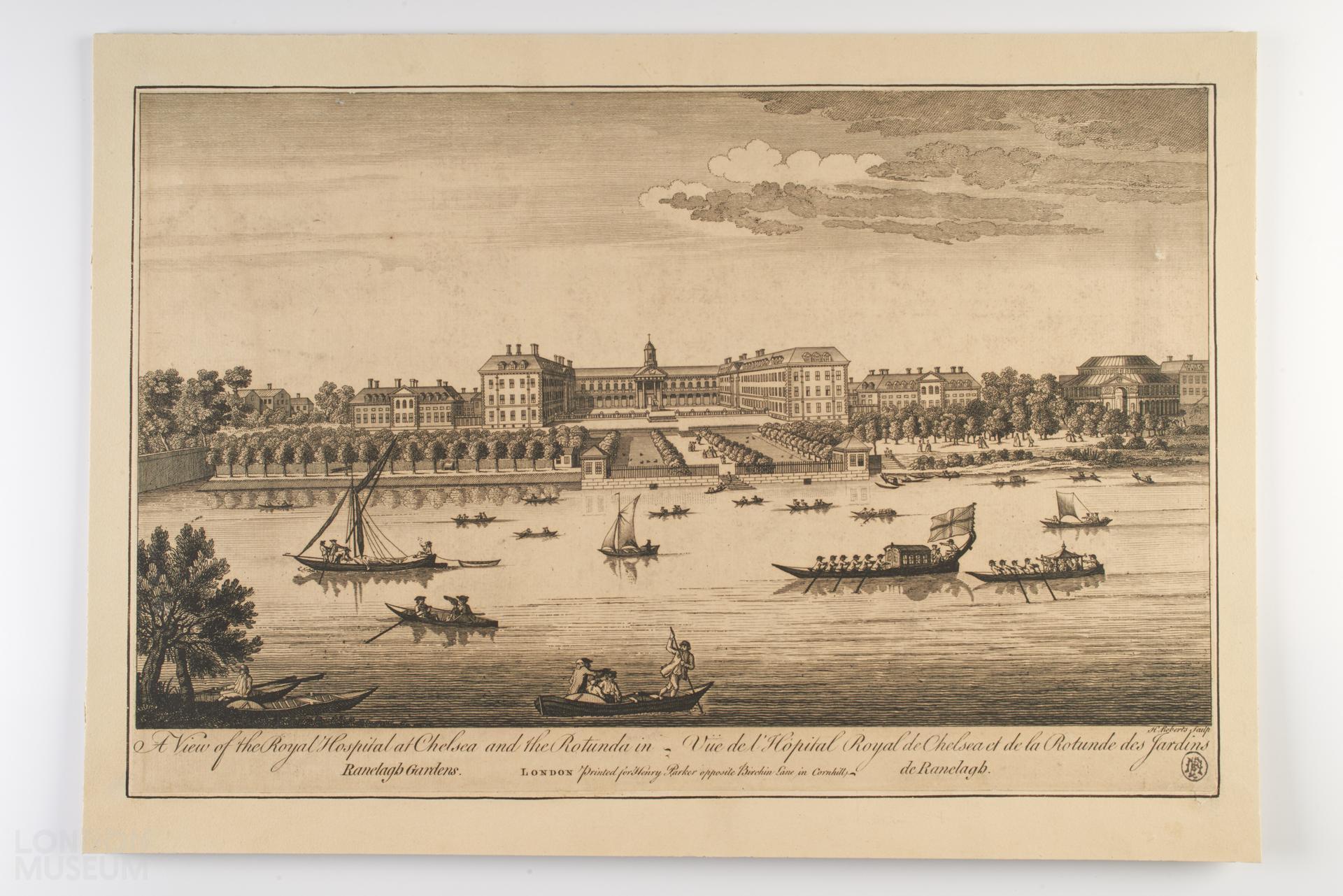 A View of the Royal Hospital at Chelsea and the Rotunda in Ranelagh Gardens. Parallel title in French and stamp on lower right corner.