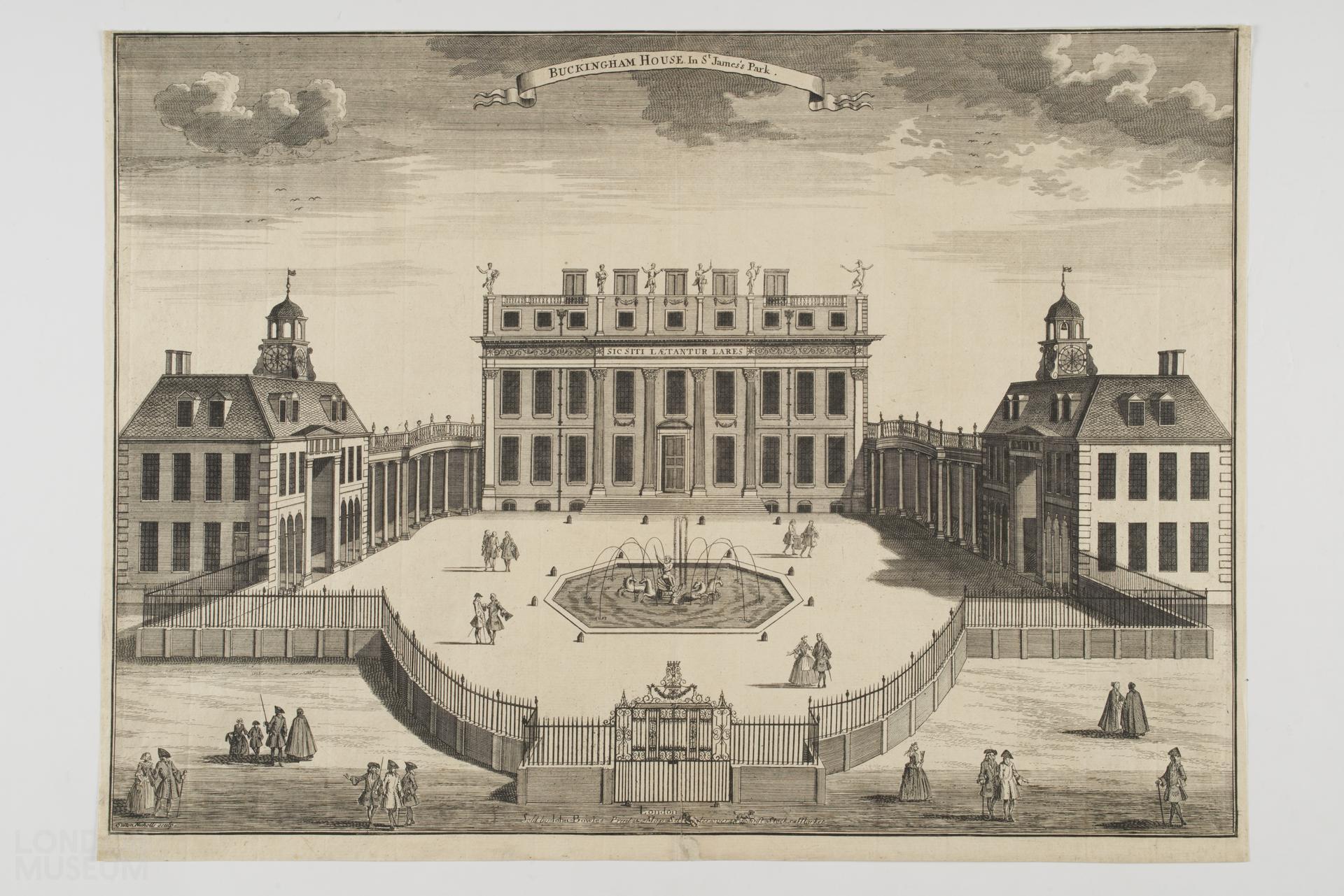 Buckingham House in St James's Park showing courtyard with fountain and railings c. 1730.