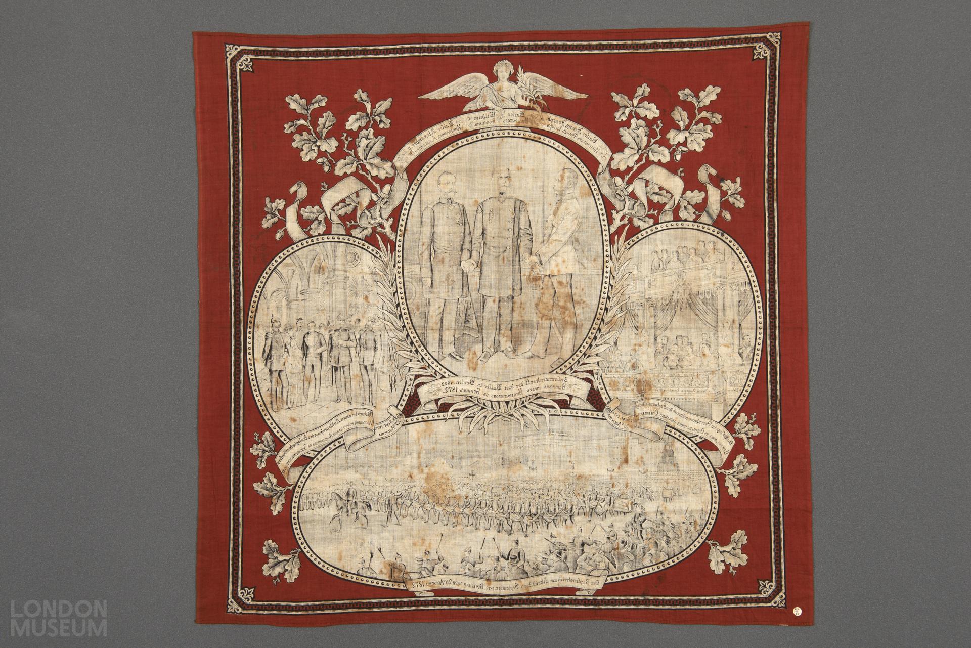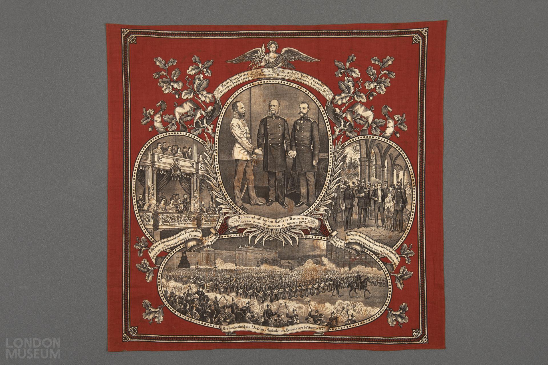 Printed handkerchief, titled 'Meeting of Emperors of German, Austria and Russia in Berlin', printed in German and Cyrillic.