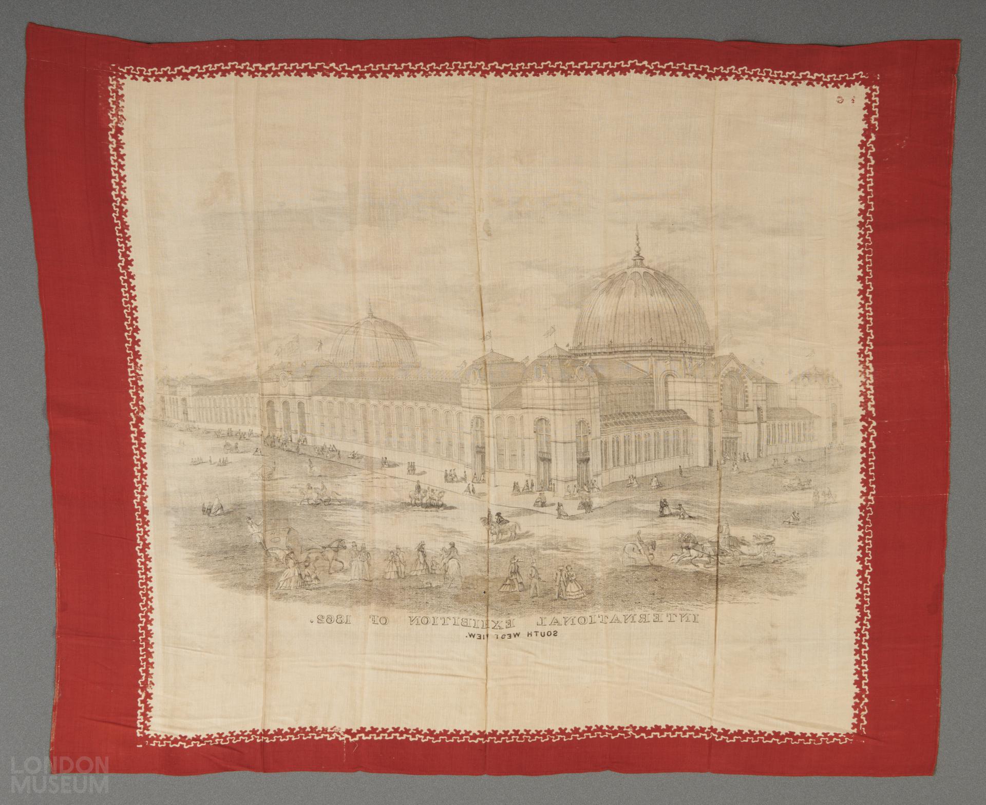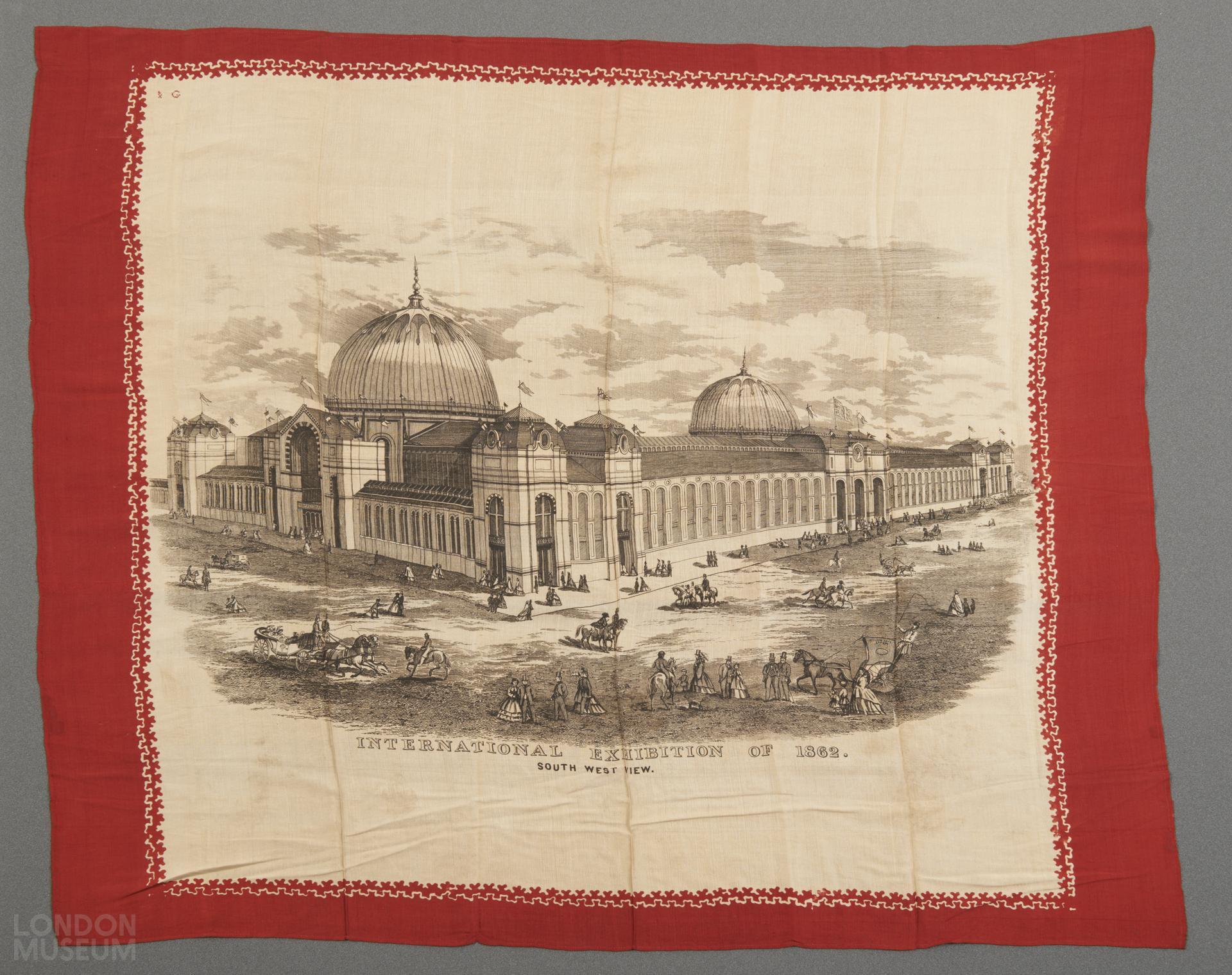 The International Exhibition of 1862 was a world fair which took place in London, capitalising on the success of the earlier Great Exhibition of 1851.This handkerchief depicts the iron and glass building which was designed to house the exhibition, and which sat on the site now occupied by the Natural History Museum, South Kensington. It was probably sold as a souvenir.