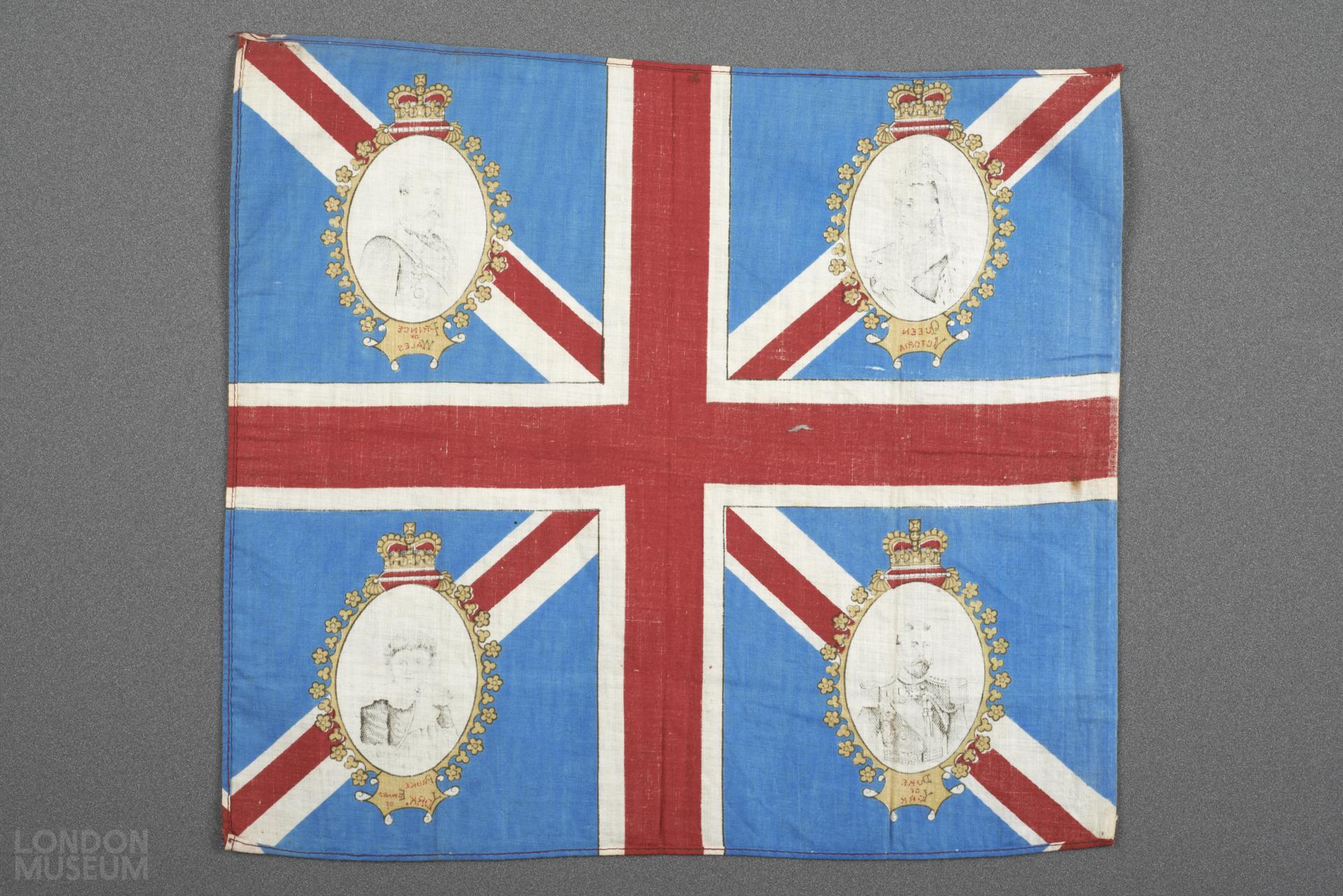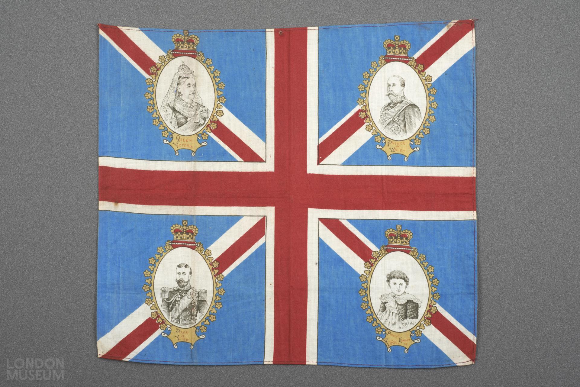 Printed handkerchief, Queen Victoria, the Prince of Wales, the Duke of York and Prince Edward of York on a union flag.