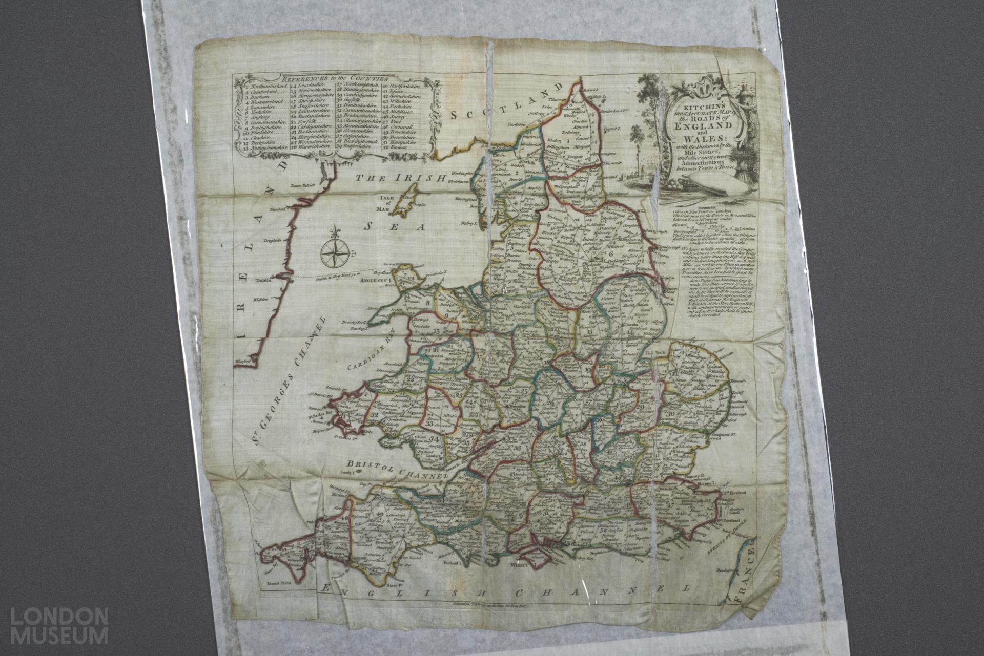 Handkerchief maps were popular with 18th century gentlemen, as they were more convenient to carry than paper maps. They could be used as a reference as well as a fashion item. This handkerchief is printed with a map of England and Wales, with the different counties outlined in hand-painted lines.