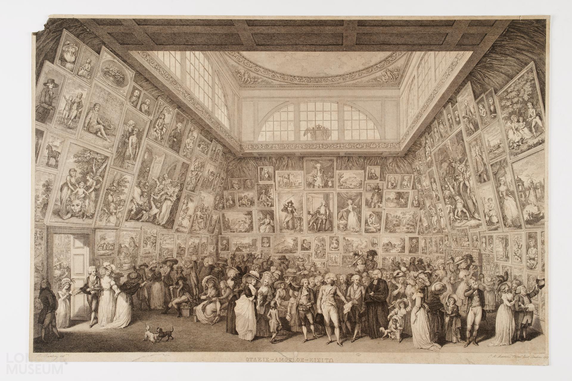 The inscription in Greek on the print reads ‘medeis amousos eisito’ namely ‘let no-one enter who is uneducated in the arts’. The crowds who attended the exhibition had to pay one shilling to enter ensuring that only the more affluent members of society could attend.